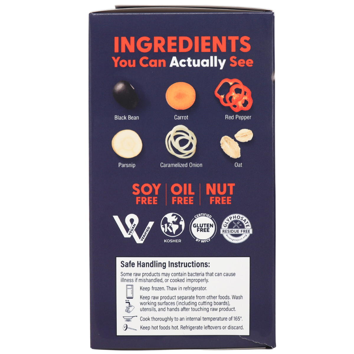 Unlike many frozen veggie patties that hide behind soy & binders, this one keeps things totally veggie based. You’ll recognize every herb & chunk, from black beans and root veggies to the simple seasoning blend that brings it all to life. Ready to crisp up in a pan or on the grill, and bringing the veggie back to veggie burgers.