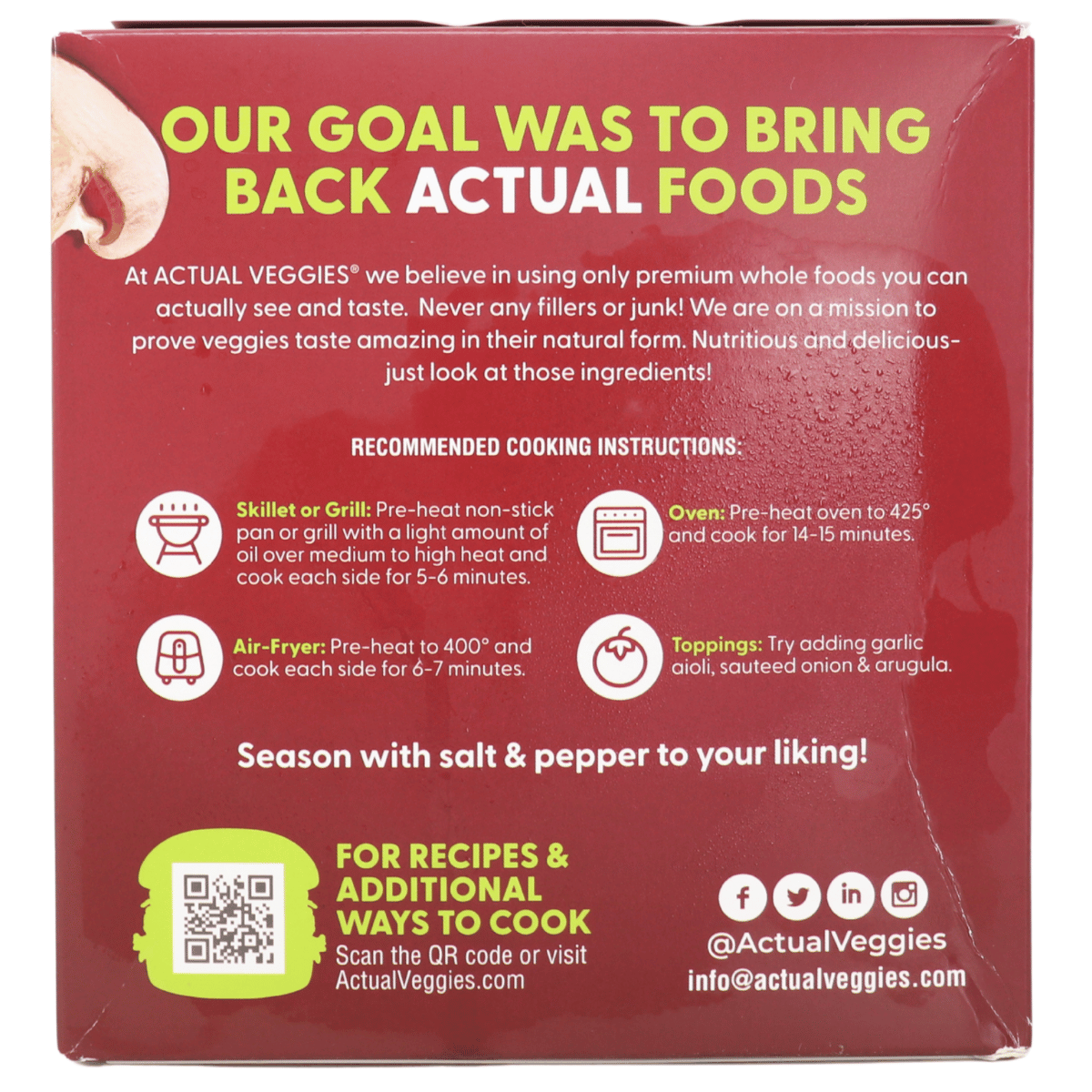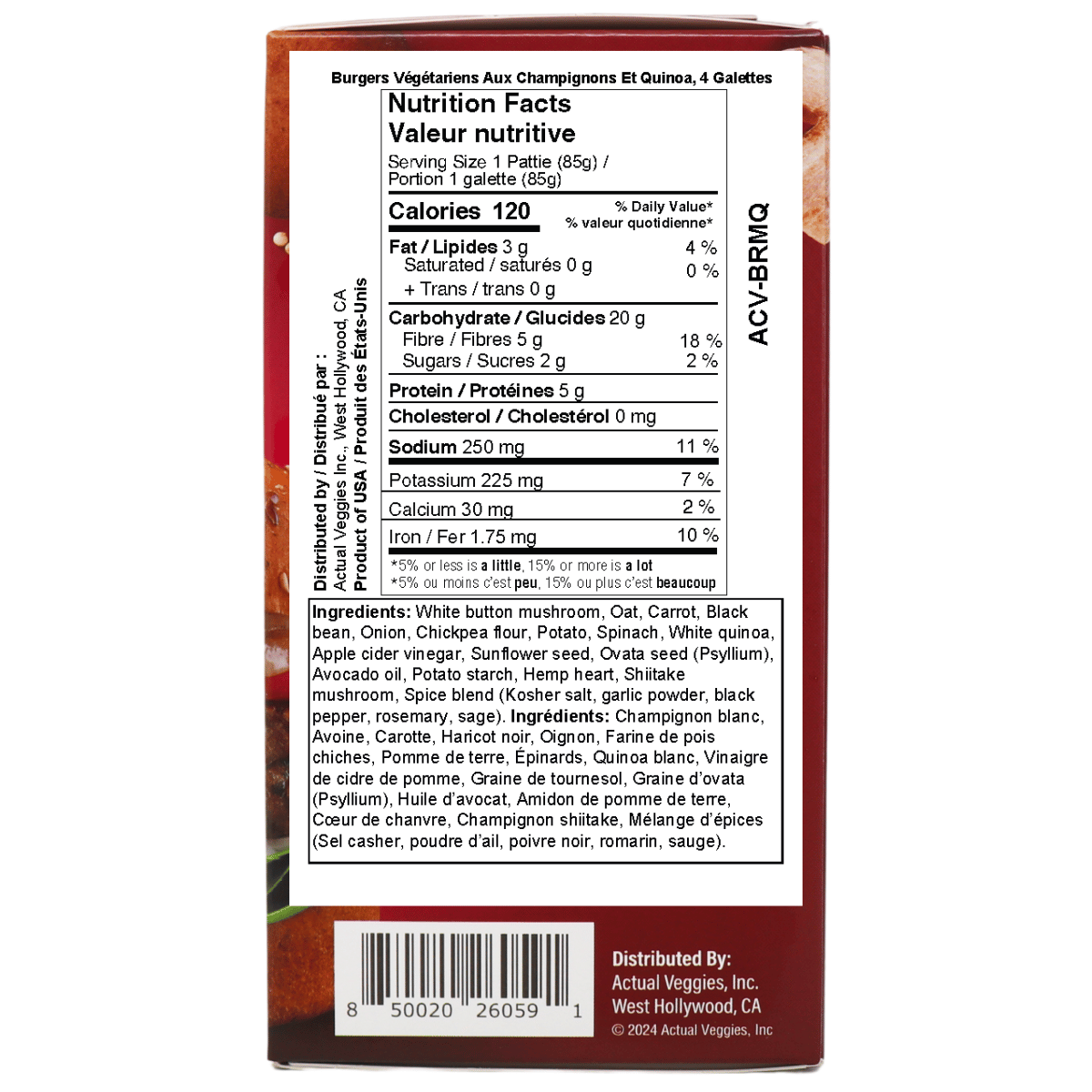 Actual Veggies Mushroom Quinoa Burger is a plant-based patty that doesn’t try to be meat, because it doesn’t have to be. It celebrates the naturally savoury depth of portobello mushrooms, nutty quinoa, and whole oats, all bound together with chickpeas and spices for that hearty veggie burger flavour you love. Thick, juicy, grillable, and ready to be the star of the show at dinner, whether you’re stacking it on a gluten-free bun or slicing it into a rice bowl.