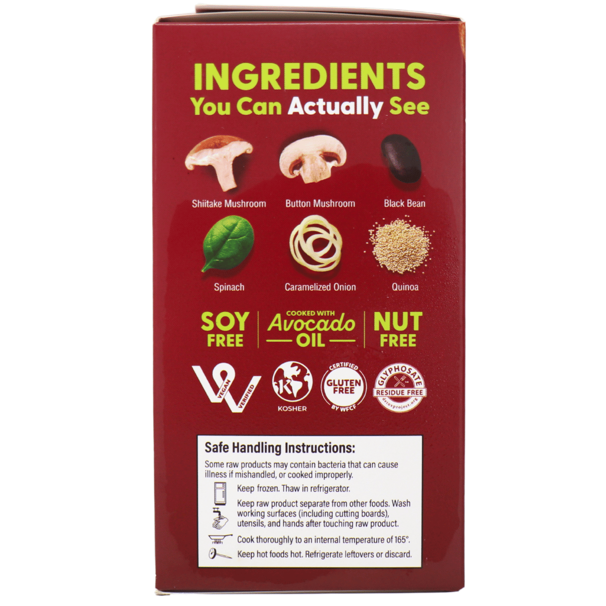 White button mushroom, Oat, Carrot, Black bean, Onion, Chickpea flour, Potato, Spinach, White quinoa, Apple cider vinegar, Sunflower seed, Ovata seed (Psyllium), Avocado oil, Potato starch, Hemp heart, Shiitake mushroom, Spice blend (Kosher salt, garlic powder, black pepper, rosemary, sage).