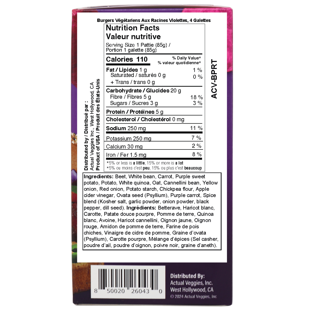 The Actual Veggies Purple Root Burger doesn’t pretend to be anything it’s not. It’s made with real root vegetables like beets, carrots, purple sweet potatoes, and parsnips, all blended with oats and chickpea flour for a thick, juicy patty full of real veggie chunks and the perfect blend of spices.