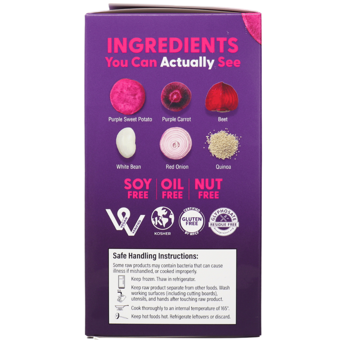 Beet, White bean, Carrot, Purple sweet potato, Potato, White quinoa, Oat, Cannellini bean, Yellow onion, Red onion, Potato starch, Chickpea flour, Apple cider vinegar, Ovata seed (Psyllium), Purple carrot, Spice blend (Kosher salt, garlic powder, onion powder, black pepper, dill seed).