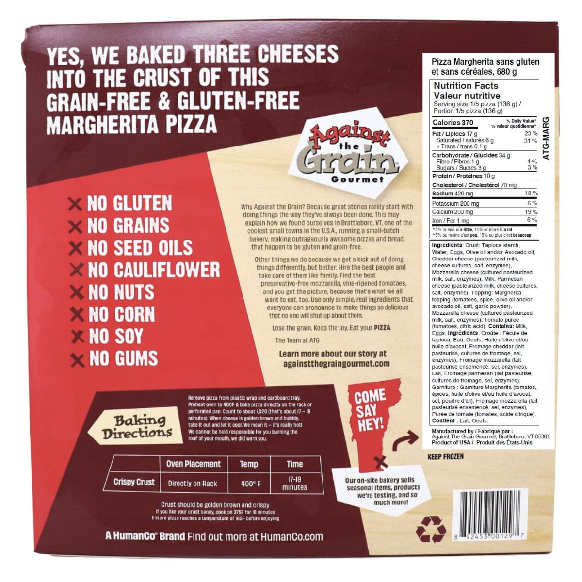 What makes Against The Grain’s Margherita pizza special, you ask? It all starts with their thin, crispy, gluten-free pizza crust that’s so good you’ll forget it’s also grain-free too (yes, really!). With cheese baked right in, it’s a soft yet chewy crust that makes for the perfect base to hold the vibrant tomato sauce, the thick, creamy slabs of fresh mozzarella, and the sprinkle of fresh basil. Made with simple ingredients and no seed oils, it’s a frozen gluten-free pizza that has elevated the classic to new and delicious heights!