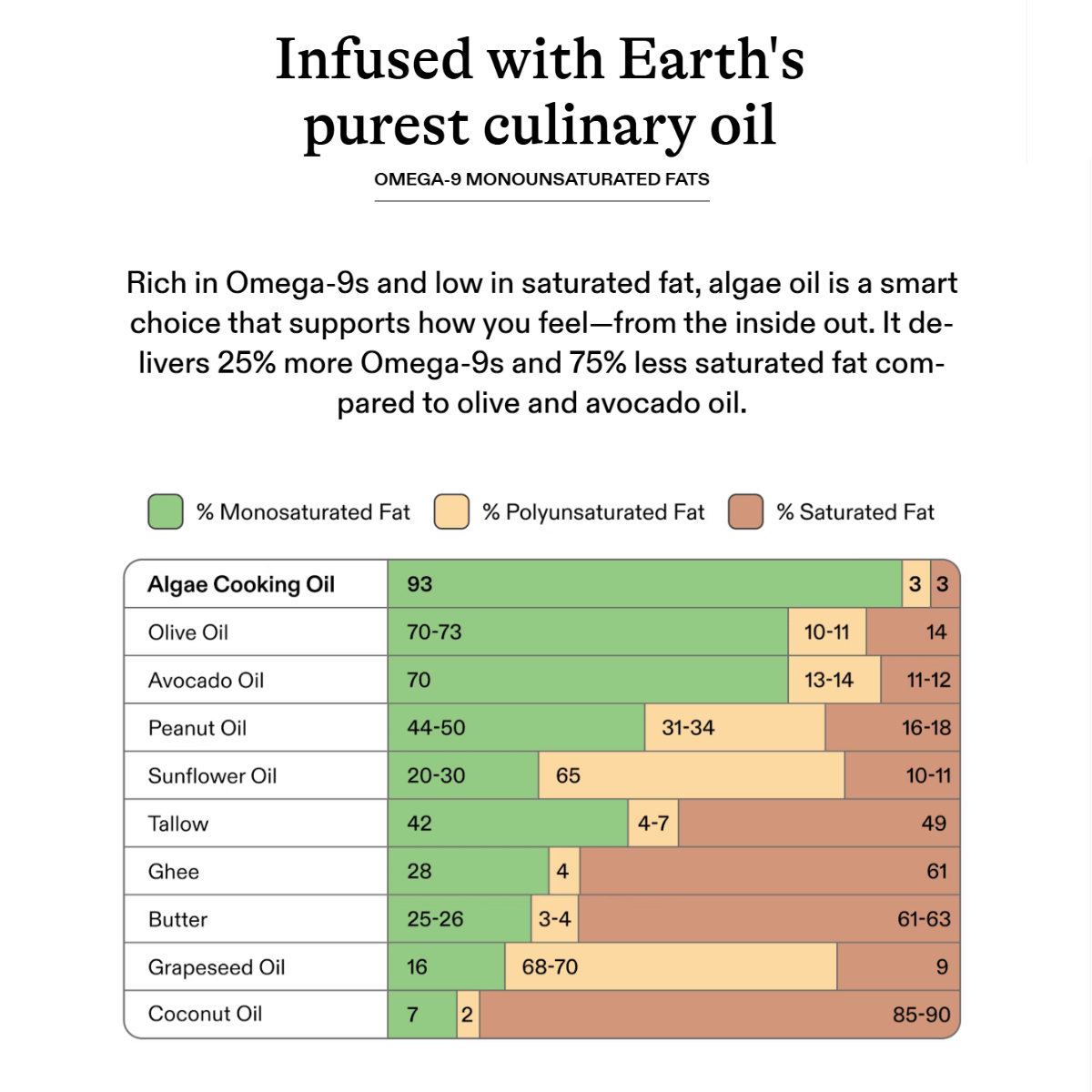 Made from climate-friendly microalgae, this neutral, high-smoke-point oil brings clean frying power to everything from stir-fries to searing, without the environmental baggage of conventional cooking oils. It’s light, mild, and made for real cooking. No weird aftertaste. No heaviness. Just a clean, all-purpose sustainable cooking oil that’s ready to take the heat. And with the convenient squeeze bottle, it’s easy to portion just the right amount for your dish, whether you’re coating a pan, dressing a salad, or finishing off roasted vegetables with style.
