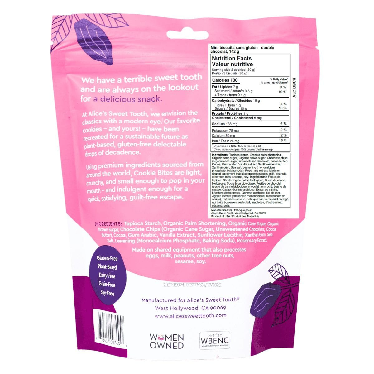 Double the chocolate, double the fun! Alice’s Sweet Tooth double chocolate cookie bites are here to fulfil your wildest cocoa cravings! Start with a rich chocolate cookie made with premium cocoa and bite into velvety chocolate chips. These gluten-free chocolate cookies are a chocolate lover’s paradise! Chocolate lifts mood and these GF chocolate cookies will have you soaring high on chocolatey joy. Whether it was a long day or you’re having one just because… these cookies are irresistible. Let the double-chocolate happiness sweep you off your feet!