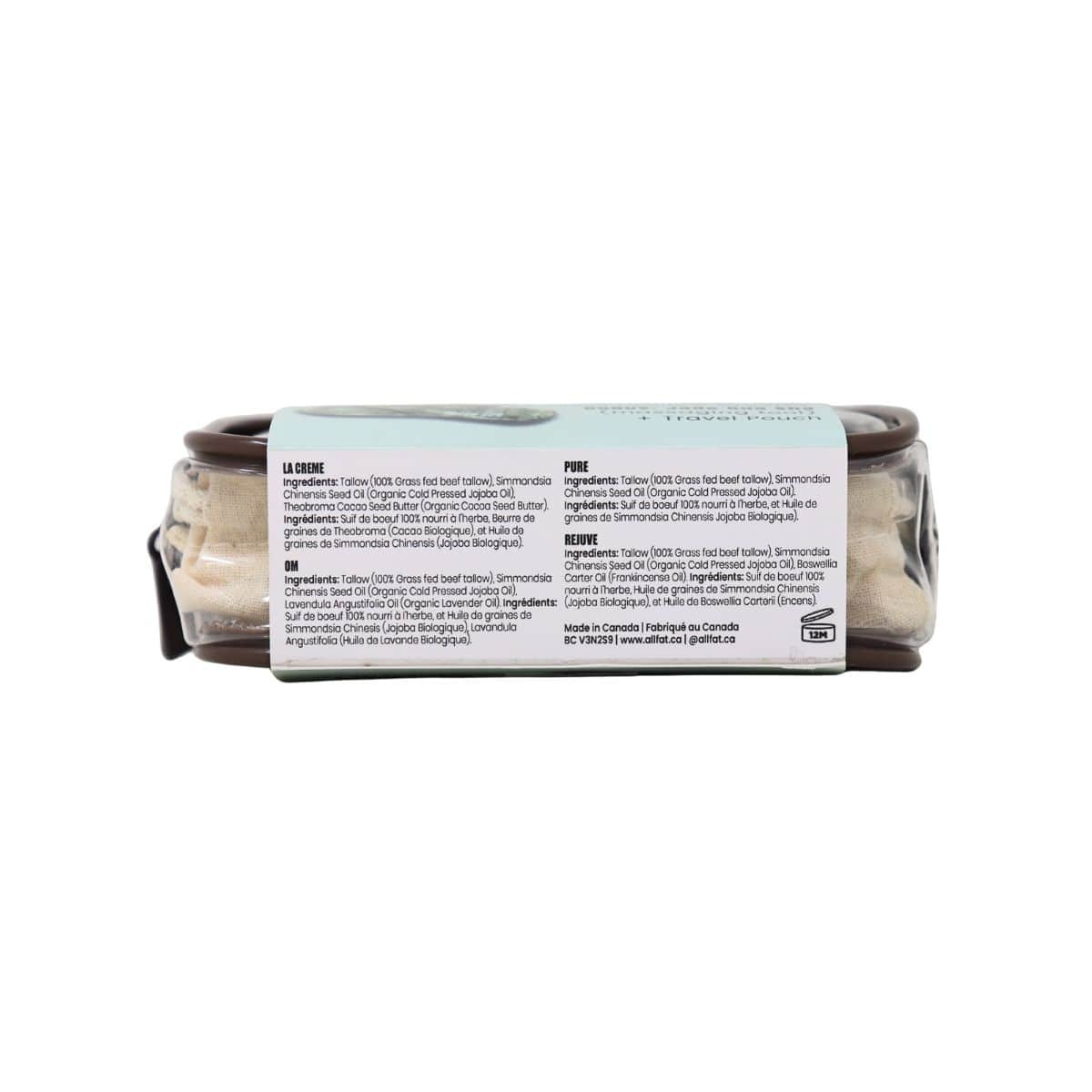 ALLFAT LA CRÈME: Tallow (100% Grass-Fed Tallow), Simmondsia Chinese Seed Oil (Organic Cold-Pressed Jojoba Oil), Theobroma Cacao Seed Butter (Organic Cacao Seed Butter).