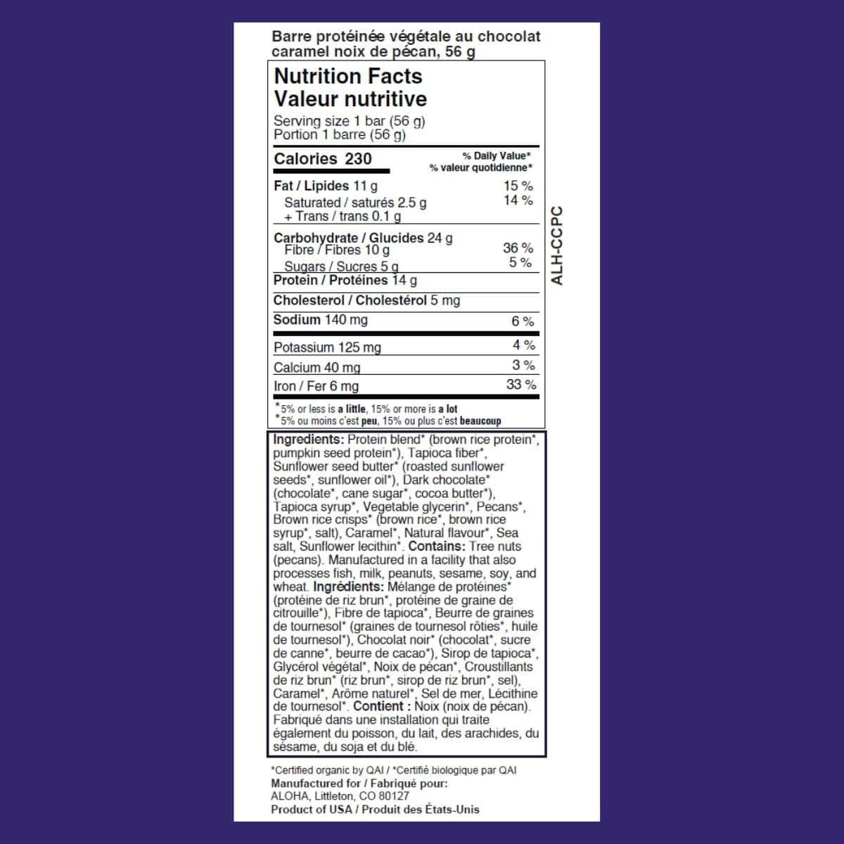 ALOHA Organic Plant-Based Protein Bar Chocolate Caramel Pecan, 56g - Protein Blend* (Brown Rice Protein*, Pumpkin Seed Protein*), Tapioca Fiber*, Sunflower Seed Butter* (Roasted Sunflower Seeds*, Sunflower Oil*), Dark Chocolate* (Chocolate*, Cane Sugar*, Cocoa Butter*), Tapioca Syrup*, Vegetable Glycerin*, Pecans*, Brown Rice Crisps* (Brown Rice*, Brown Rice Syrup*, Salt), Caramel*, Natural Flavor*, Sea Salt, Sunflower Lecithin*