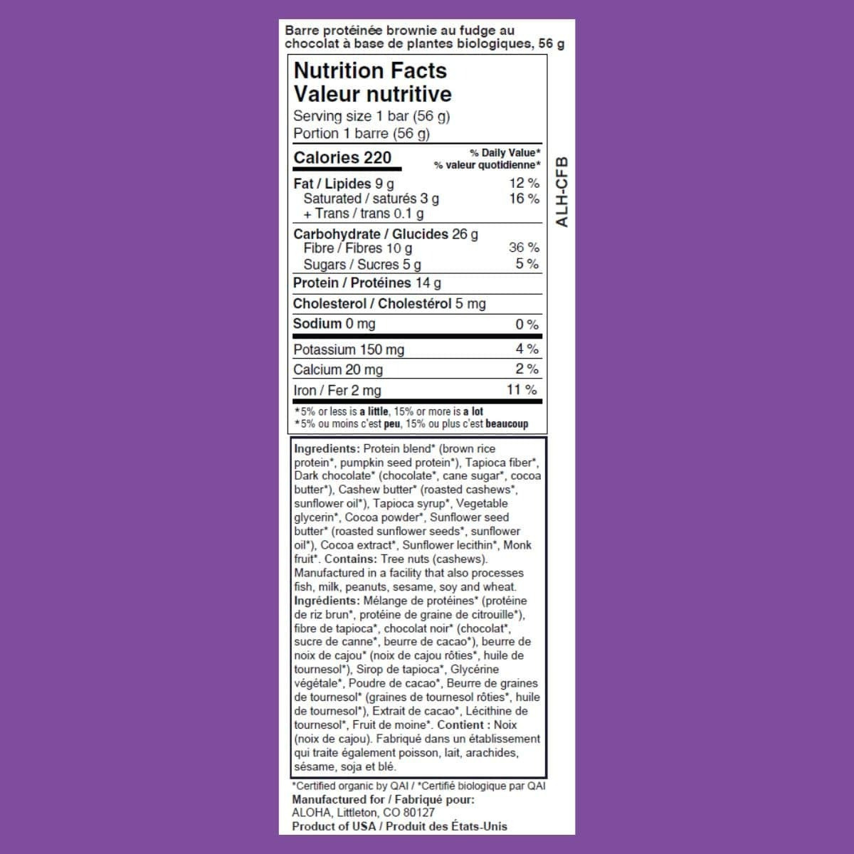 ALOHA Organic Plant-Based Protein Bar Chocolate Fudge Brownie, 56g - Protein Blend* (Brown Rice Protein*, Pumpkin Seed Protein*), Tapioca Fiber*, Dark Chocolate* (Chocolate*, Cane Sugar*, Cocoa Butter*), Cashew Butter* (Roasted Cashews*, Sunflower Oil*), Tapioca Syrup*, Vegetable Glycerin*, Cocoa Powder*, Sunflower Seed Butter* (Roasted Sunflower Seeds*, Sunflower Oil*), Cocoa Extract*, Sunflower Lecithin*, Monk Fruit*