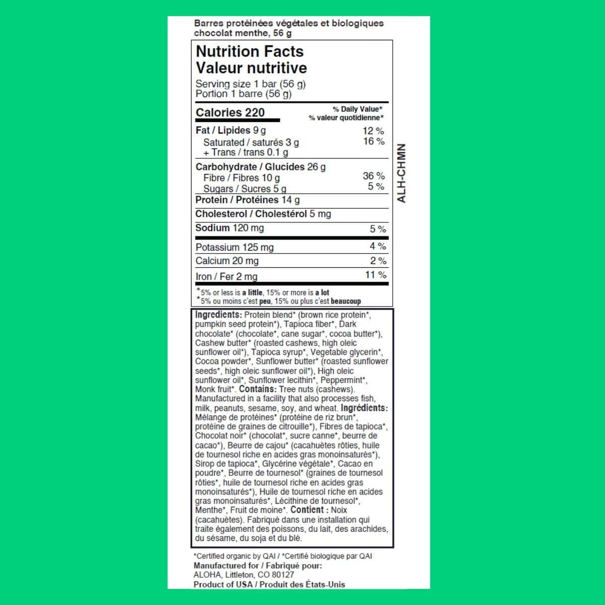 ALOHA Organic Plant-Based Protein Bar Chocolate Mint, 56g - Protein Blend* (Brown Rice Protein*, Pumpkin Seed Protein*), Tapioca Fiber*, Dark Chocolate* (Chocolate*, Cane Sugar*, Cocoa Butter*), Cashew Butter* (Roasted Cashews, High Oleic Sunflower Oil*), Tapioca Syrup*, Vegetable Glycerin*, Cocoa Powder*, Sunflower Butter* (Roasted Sunflower Seeds*, High Oleic Sunflower Oil*), High Oleic Sunflower Oil*, Sunflower Lecithin*, Peppermint*, Monk Fruit*