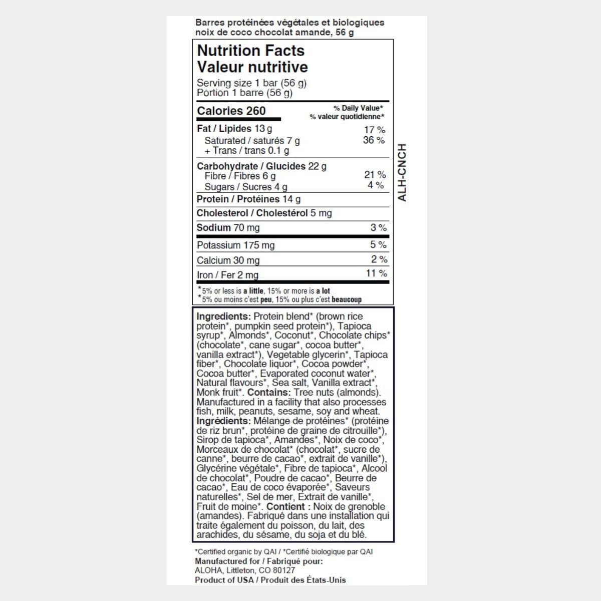 ALOHA Organic Plant-Based Protein Bar Coconut Chocolate Almond, 56g - Protein Blend* (Brown Rice Protein*, Pumpkin Seed Protein*), Tapioca Syrup*, Almonds*, Coconut*, Chocolate Chips* (Chocolate*, Cane Sugar*, Cocoa Butter*, Vanilla Extract*), Vegetable Glycerin*, Tapioca Fiber*, Chocolate Liquor*, Cocoa Powder*, Cocoa Butter*, Evaporated Coconut Water*, Natural Flavors*, Sea Salt, Vanilla Extract*, Monk Fruit*
