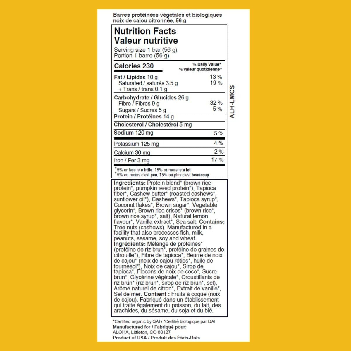 ALOHA Organic Plant-Based Protein Bar Lemon Cashew, 56g - Protein Blend* (Brown Rice Protein*, Pumpkin Seed Protein*), Tapioca Fiber*, Cashew Butter* (Roasted Cashews*, Sunflower Oil*), Cashews*, Tapioca Syrup*, Coconut Flakes*, Brown Sugar*, Vegetable Glycerin*, Brown Rice Crisps* (Brown Rice*, Brown Rice Syrup*, Salt), Natural Lemon Flavor*, Vanilla Extract*, Sea Salt