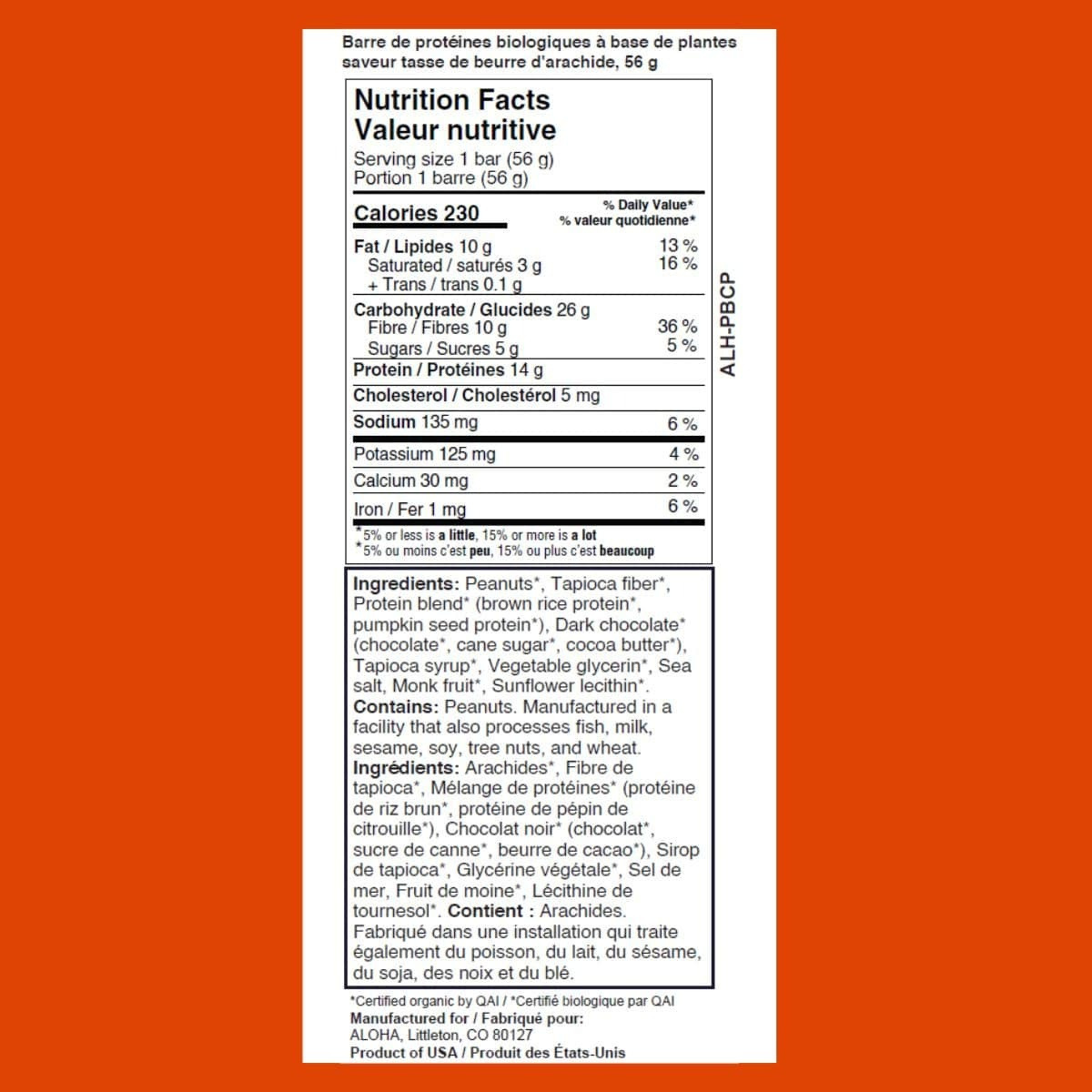 ALOHA Organic Plant-Based Protein Bar Peanut Butter Cup, 56g - Peanuts*, Tapioca Fiber*, Protein Blend* (Brown Rice Protein*, Pumpkin Seed Protein*), Dark Chocolate* (Chocolate*, Cane Sugar*, Cocoa Butter*), Tapioca Syrup*, Vegetable Glycerin*, Sea Salt, Monk Fruit*, Sunflower Lecithin*