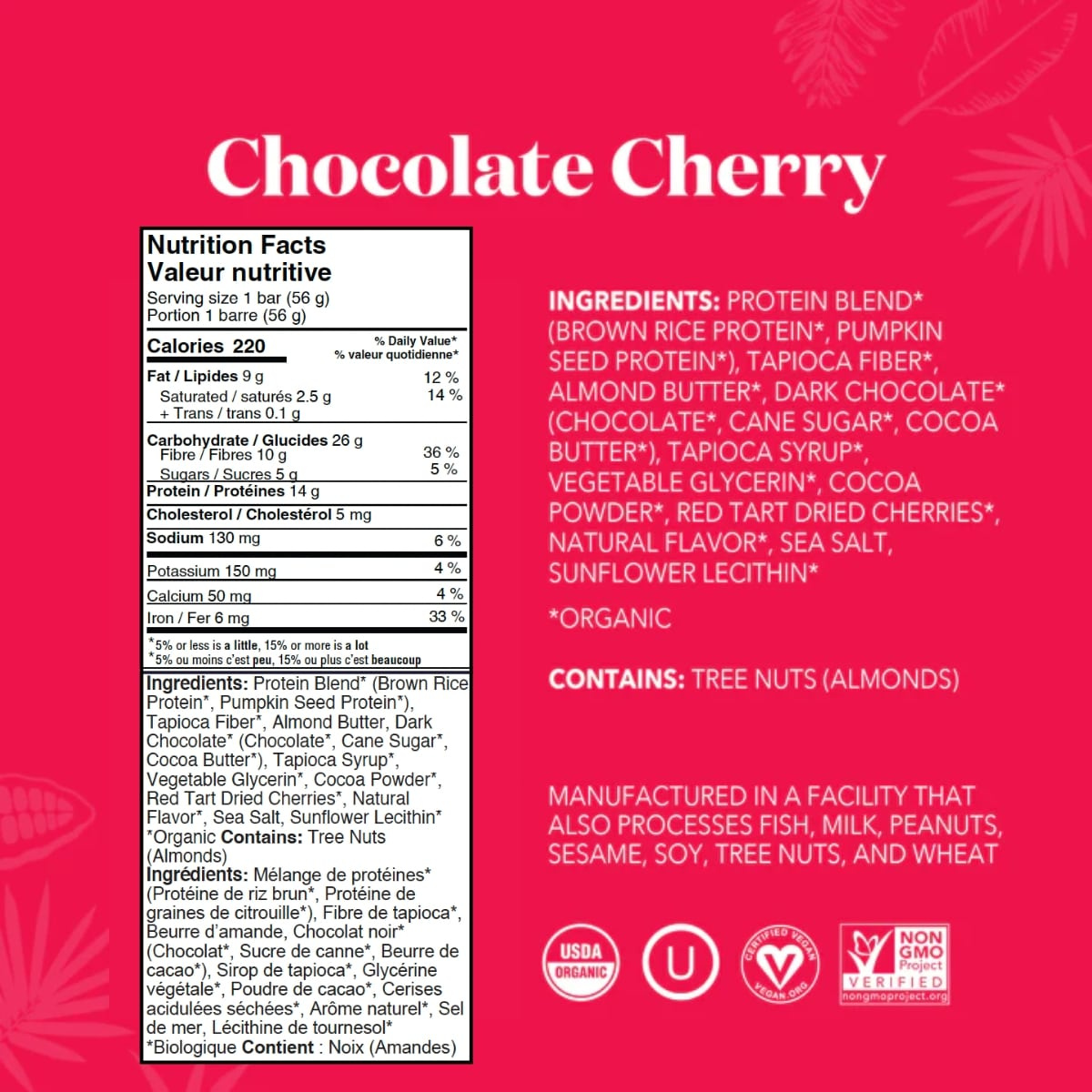 Protein Blend* (Brown Rice Protein*, Pumpkin Seed Protein*), Tapioca Fiber*, Almond Butter, Dark Chocolate* (Chocolate*, Cane Sugar*, Cocoa Butter*), Tapioca Syrup*, Vegetable Glycerin*, Cocoa Powder*, Red Tart Dried Cherries*, Natural Flavor*, Sea Salt, Sunflower Lecithin*
