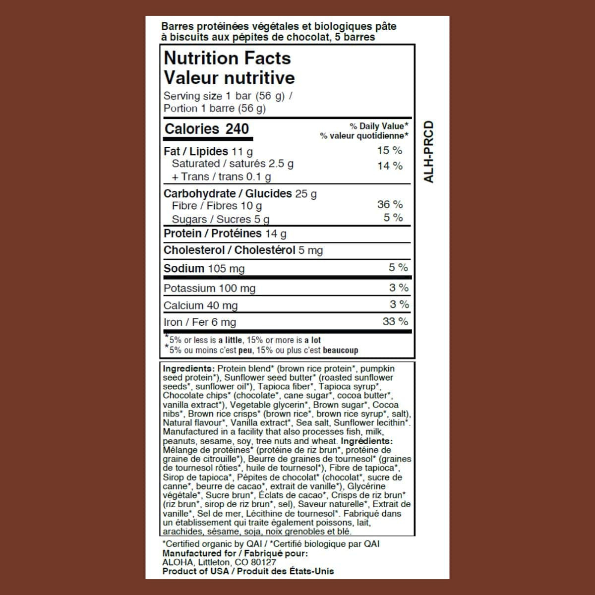 ALOHA Organic Plant-Based Protein Bar Chocolate Chip Cookie Dough Box, 5 Bars