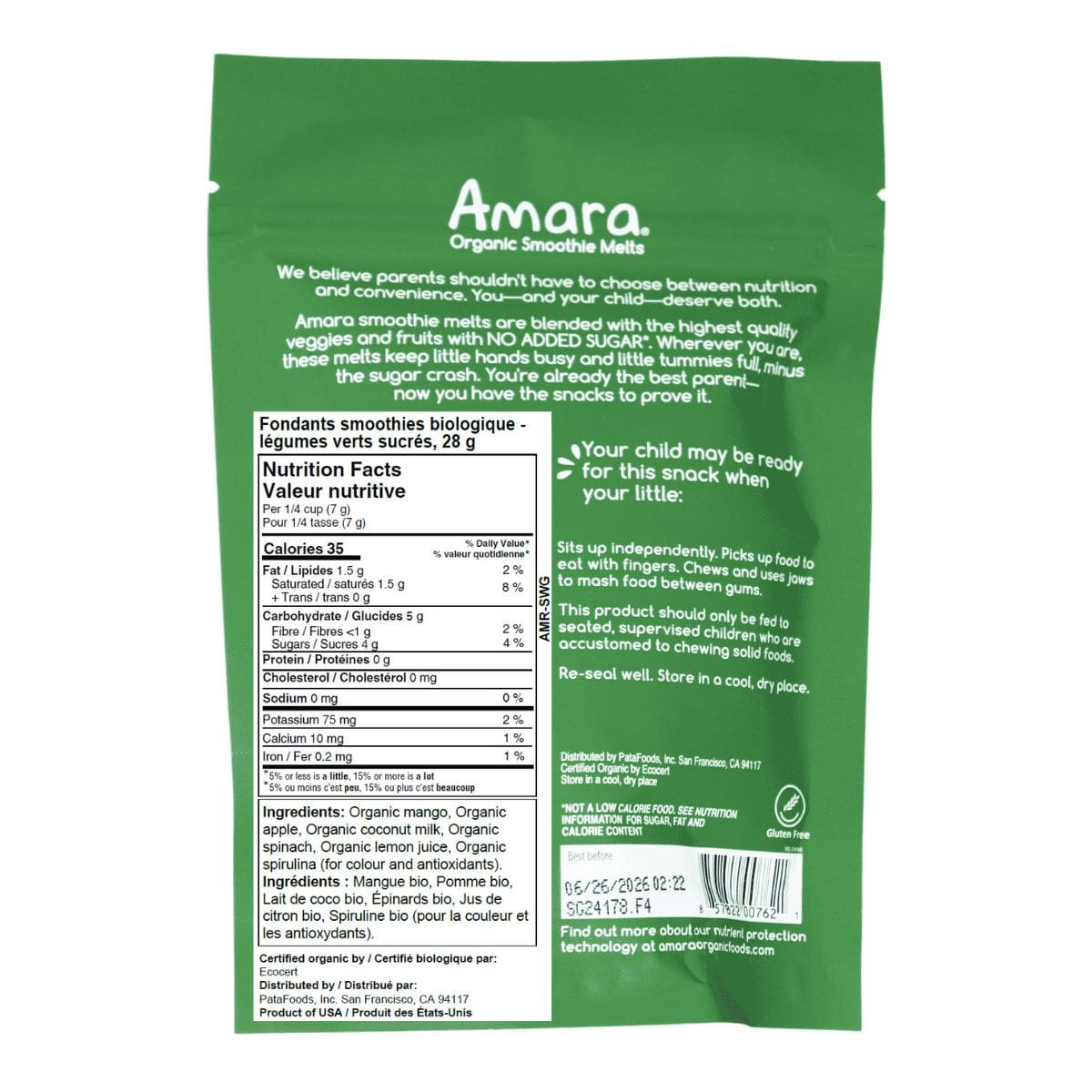 Get ready to leaf your worries behind! Amara Mighty Sweet Greens Smoothie Melts are the ultimate snack for your tiny explorer. Packed with real fruit and veggie goodness, these little bites are a powerhouse of flavour and nutrients. They’re made with wholesome ingredients like organic mango, apple, spinach and coconut milk. Sprinkle with spirulina and you got yourself this healthy snack for the little ones. Let the busy little hands master the art of self-feeding. Also, NO ADDED SUGAR means no added stress! Keep the fun flowing and let the mess stay away. These delicious bites are lightweight, resealable and your go-to on-the-go snack. Is it playtime? Snack time? Grab a handful and let them taste buds kale it with joy!