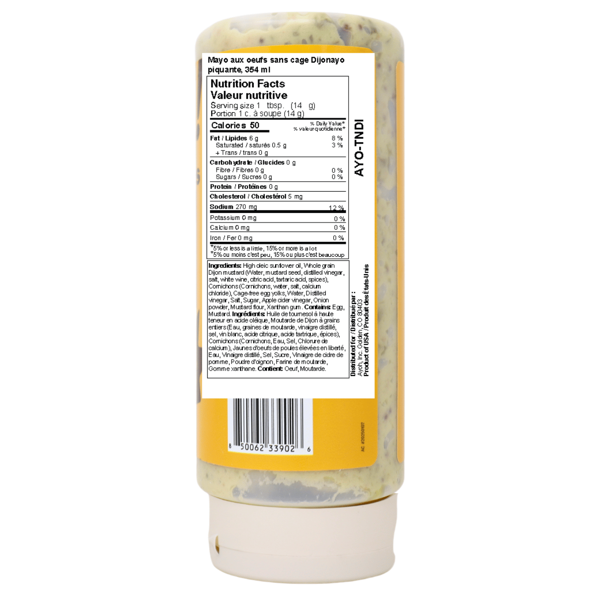 High oleic sunflower oil, Whole grain Dijon mustard (Water, mustard seed, distilled vinegar, salt, white wine, citric acid, tartaric acid, spices), Cornichons (Cornichons, water, salt, calcium chloride), Cage-free egg yolks, Water, Distilled vinegar, Salt, Sugar, Apple cider vinegar, Onion powder, Mustard flour, Xanthan gum.