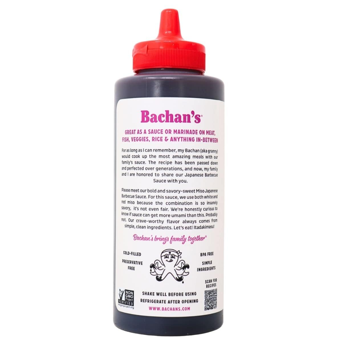 Straight from their kitchen to yours, Bachan's Miso Japanese Barbecue Sauce is a celebration of simplicity and flavour integrity. With no preservatives, no additives, and definitely no artificial flavourings all thanks to their unique small-batch, cold-fill technique. Bachan's isn't just a sauce; it's a commitment to quality, ensuring that each bottle is packed with crave-worthy flavours that come naturally from the most delicious, simple ingredients like a blend of red AND white miso, a splash of real mirin, and premium Japan-brewed soy sauce. Add in a sprinkle of organic ginger, a kick of organic garlic, and the freshness of green onion, whether you're grilling up a storm with chicken, making waves with fish, or unleashing veggie power, this umami-filled, teriyaki-ish Japanese BBQ sauce is your culinary sensei–teaching your dishes the art of savoury perfection. Get saucy, get Bachan's!