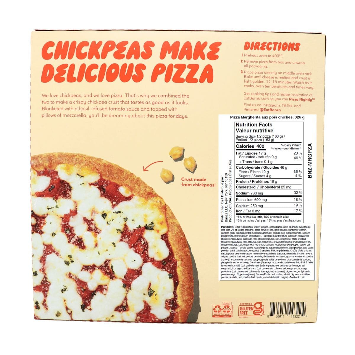 Looking for a pizza with some pizzaz? Let Banza’s Margherita pizza show you how it’s done! With a crispy, doughy, chickpea pizza crust that gives you more protein, more fibre, and fewer carbs, Banza is changing everything that you know about frozen pizza. Packed with 16g of protein and 10g of fibre, this gluten-free pizza is topped with vibrant San Marzano tomato sauce, fragrant basil, and rich mozzarella, making it a classic at heart but with a much-needed twist! Whether it’s a workday dinner or weekend treat, this Margherita protein pizza is going to remind you why pizza nights are always worth it.