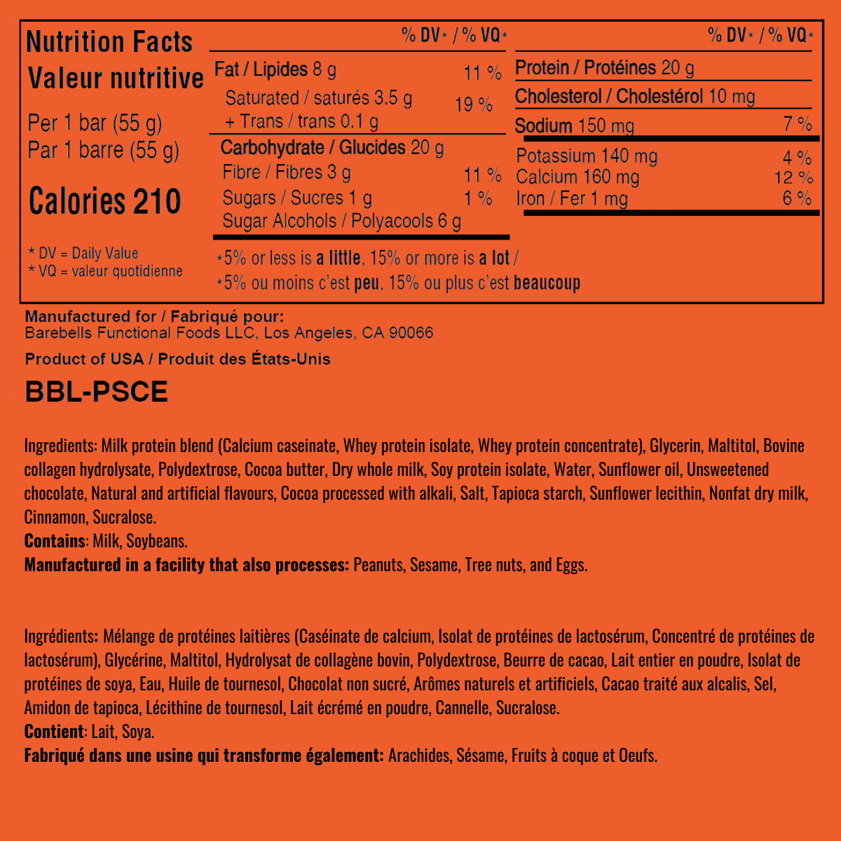 Milk protein blend (Calcium caseinate, Whey protein isolate, Whey protein concentrate), Glycerin, Maltitol, Bovine collagen hydrolysate, Polydextrose, Cocoa butter, Dry whole milk, Soy protein isolate, Water, Sunflower oil, Unsweetened chocolate, Natural and artificial flavours, Cocoa processed with alkali, Salt, Tapioca starch, Sunflower lecithin, Nonfat dry milk, Cinnamon, Sucralose.