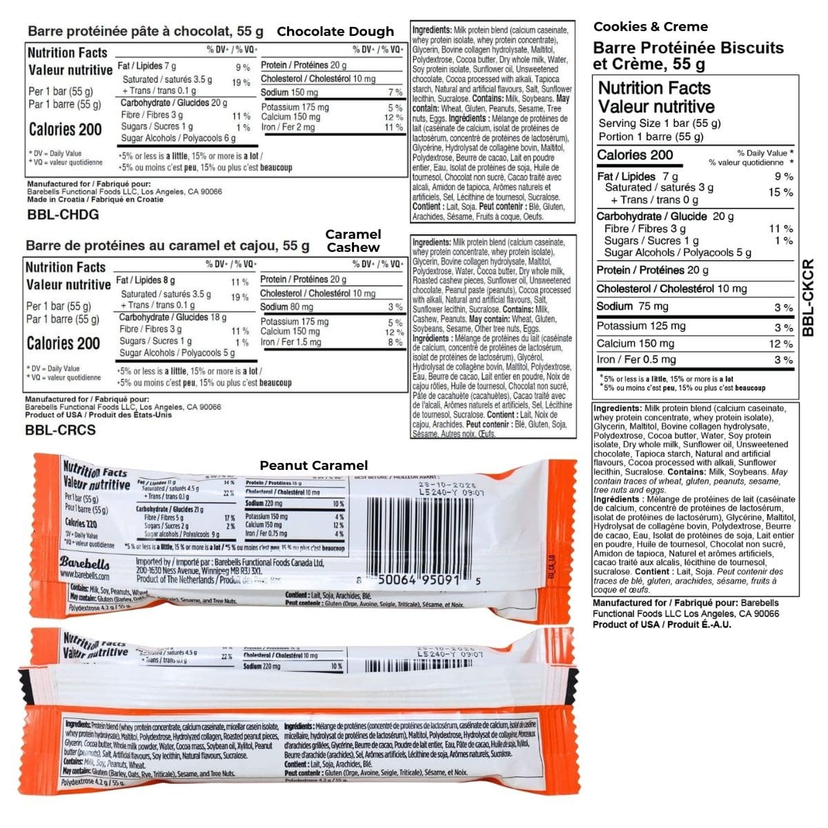 Barebells Protein Bar Chocolate Dough, 55g - Milk protein blend (calcium caseinate, whey protein isolate, whey protein concentrate), Glycerin, Bovine collagen hydrolysate, Maltitol, Polydextrose, Cocoa butter, Dry whole milk, Water, Soy protein isolate, Sunflower oil, Unsweetened chocolate, Cocoa processed with alkali, Tapioca starch, Natural and artificial flavours, Salt, Sunflower lecithin, Sucralose.