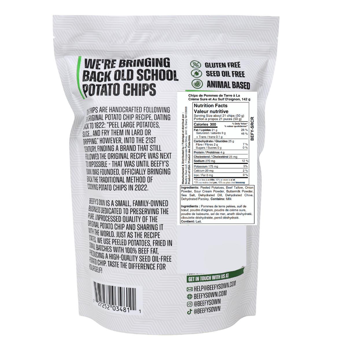 Beefy’s Own Sour Cream N’ Onion Tallow-Fried Potato Chips are a throwback to snacks full of simple, real flavour. Fried in 100% beef tallow (not seed oils), these chips deliver a rich, savoury crunch that perfectly complements the bright, tangy sour cream and onion seasoning.