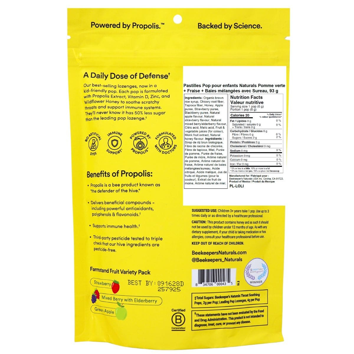 Beekeeper’s Naturals Kid’s Pop Lozenges Green Apple + Strawberry + Mixed Berry With Elderberry, 15 pack