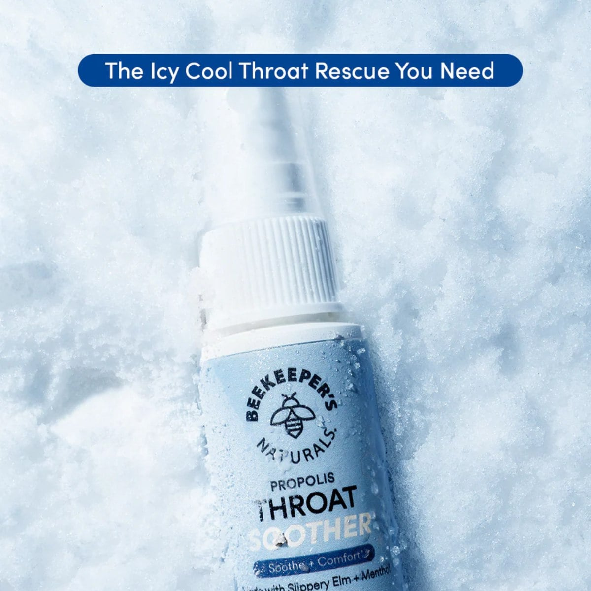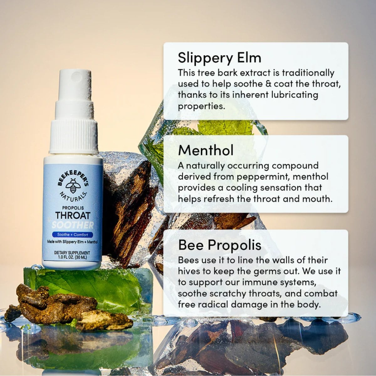 Soothe your throat and refresh your day with Beekeeper’s Naturals Propolis Slippery Elm + Menthol Throat Soother. This natural throat spray blends bee propolis, slippery elm, and menthol for instant cooling comfort and immune support when you need it most. Perfect for dry air, long days of talking, or seasonal tickles, it delivers that clean, minty chill while coating your throat in plant-powered relief.