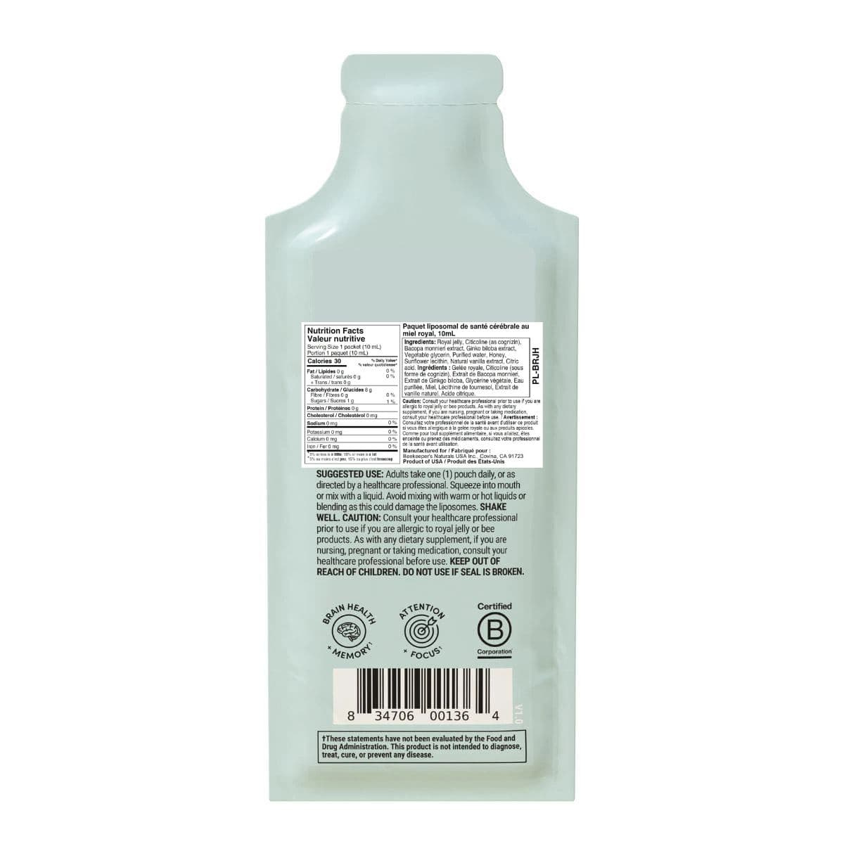 Beekeeper’s Naturals Royal Jelly Brain Health Liposomal Packet, 10mL - Royal Jelly, Citicoline (As Cognizin), Bacopa Monnieri Extract, Ginko Biloba Extract, Vegetable Glycerin, Purified Water, Honey, Sunflower Lecithin, Natural Vanilla Extract, Citric Acid.