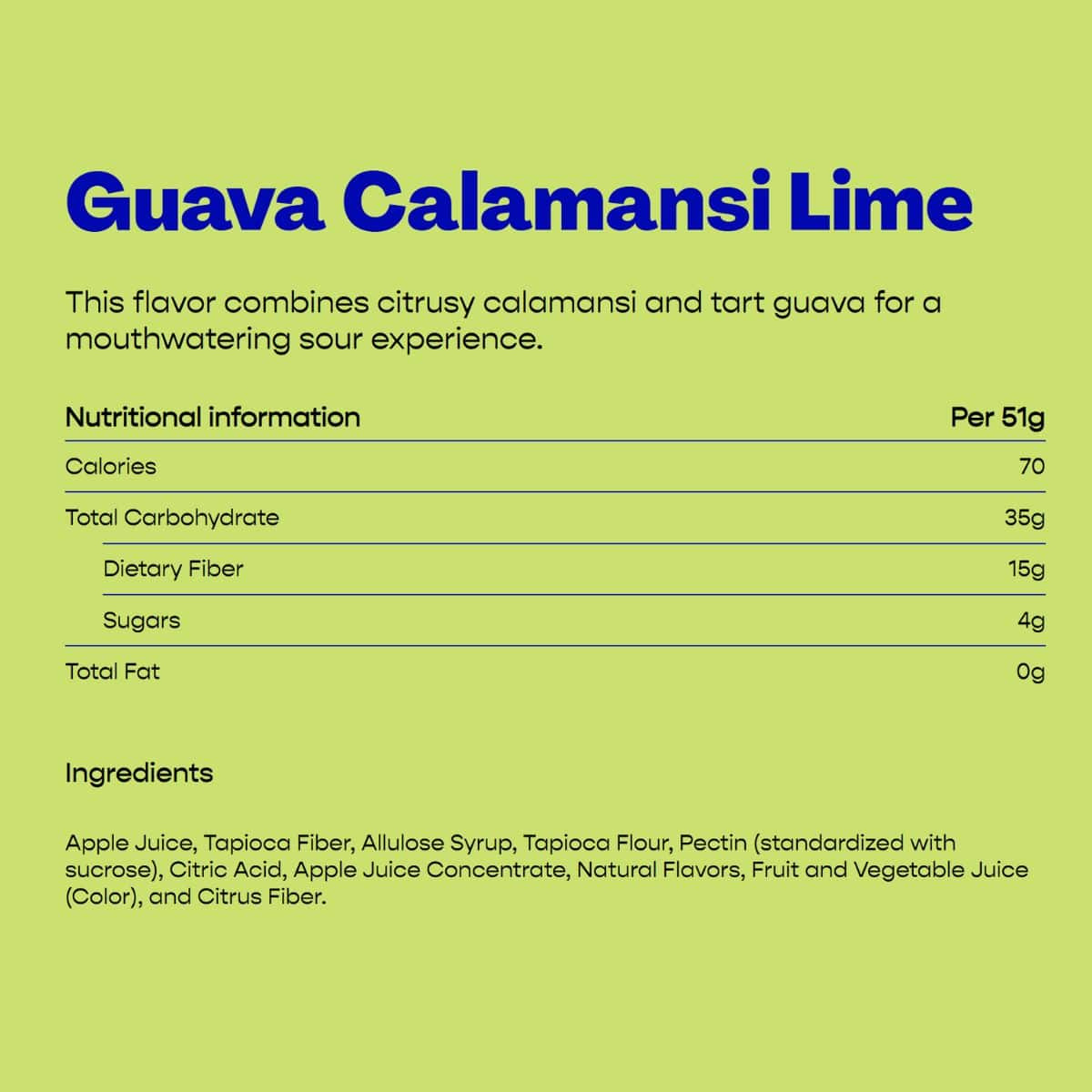 Apple juice, Tapioca fibre, Allulose syrup, Tapioca flour, Pectin (standardized with sucrose), Citric acid, Apple juice concentrate, Natural flavours, Fruit and vegetable juice (colour), Citrus fibre.