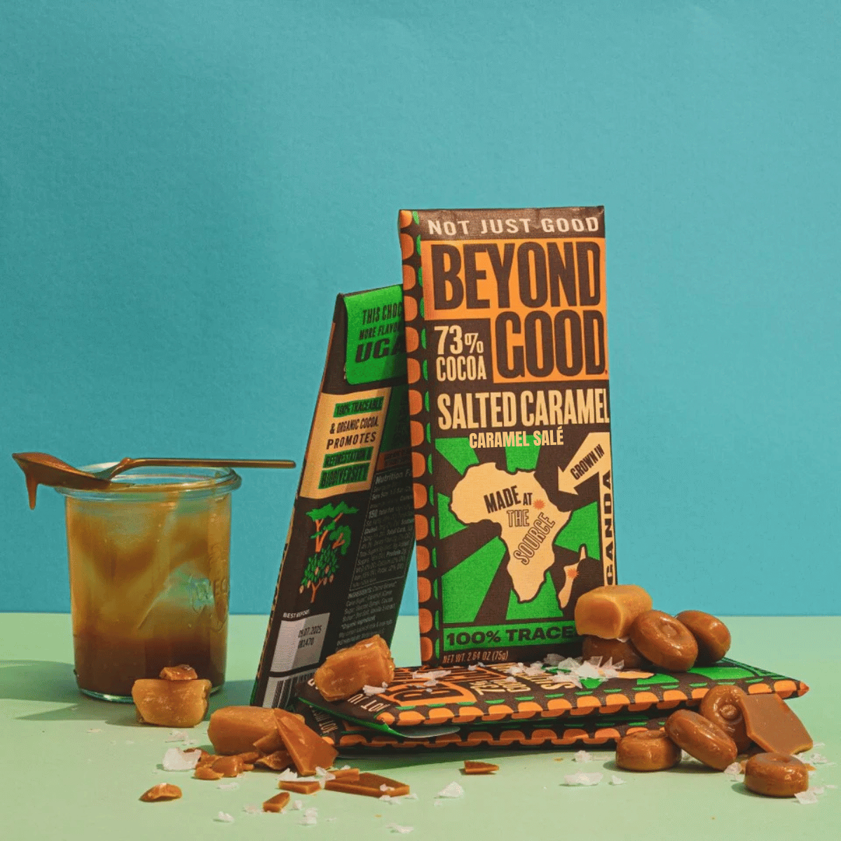 Smooth, caramel crunch in every bite. Beyond Good 73% Salted Caramel Dark Chocolate brings together bold ethics and simple pleasure in one fair-trade bar.Â