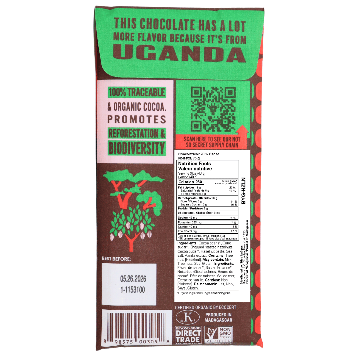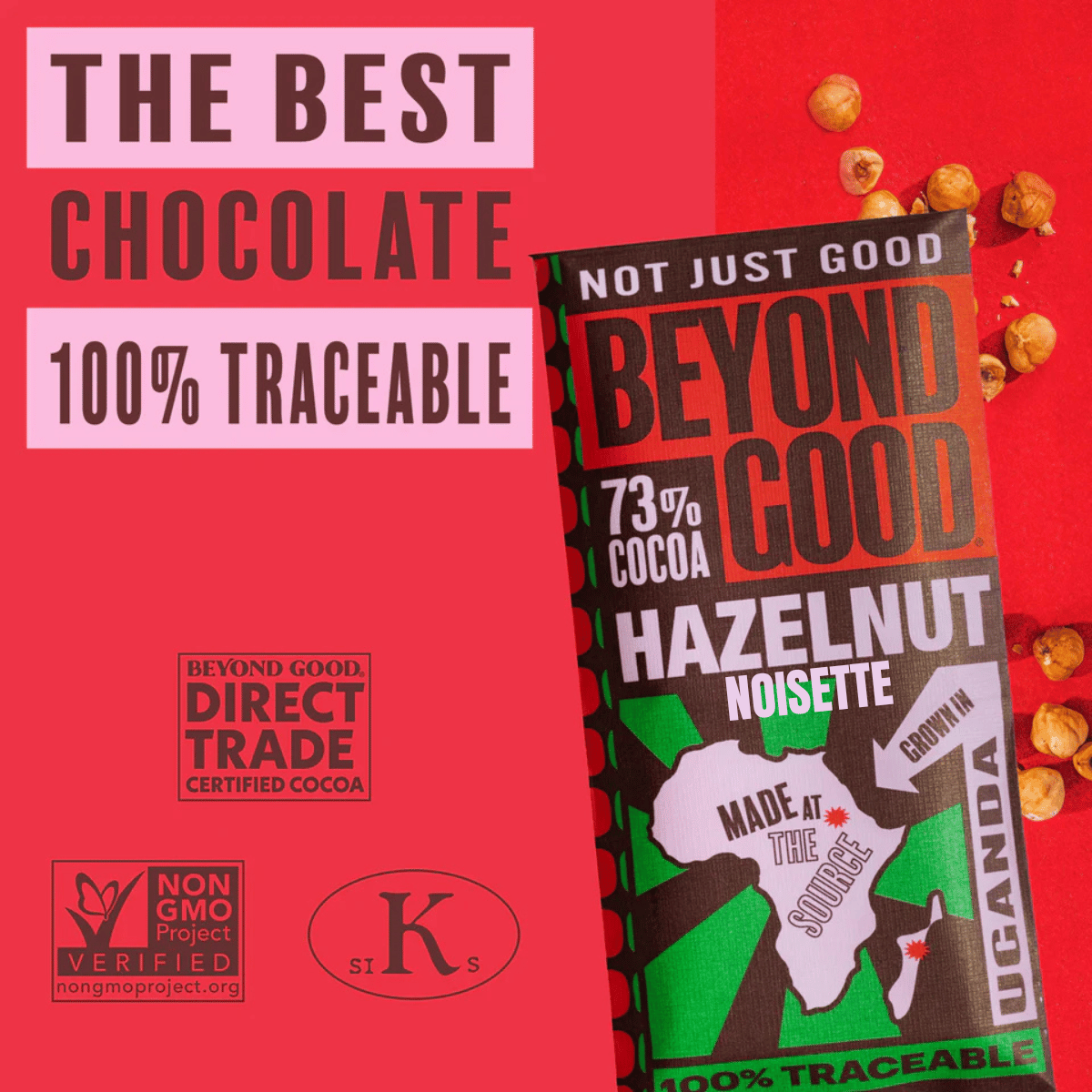 Crunchy, roasted, and deeply satisfying. Beyond Good 73% Hazelnut Dark Chocolate delivers more than just a classic pairing. It offers a rare look at what happens when whole roasted hazelnuts meet heirloom cacao at the place where both are grown.