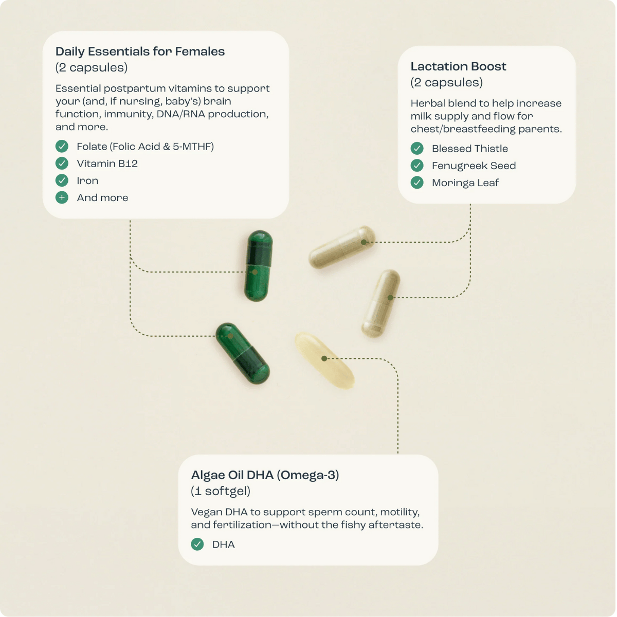 This supplement combo covers the bases with vitamins and minerals your body needs for healing & energy postpartum to support mom, and milk production to support your little one. That means replenishing iron stores. Supporting bone health with calcium and vitamin D. Topping up B12 and DHA to fuel your body. Everything your body needs on its postpartum healing journey, one convenient daily vitamin pack at a time.