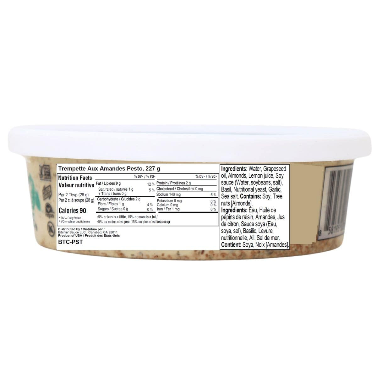 Water, Grapeseed oil, Almonds, Lemon juice, Soy sauce (Water, soybeans, salt), Basil, Nutritional yeast, Garlic, Sea salt.