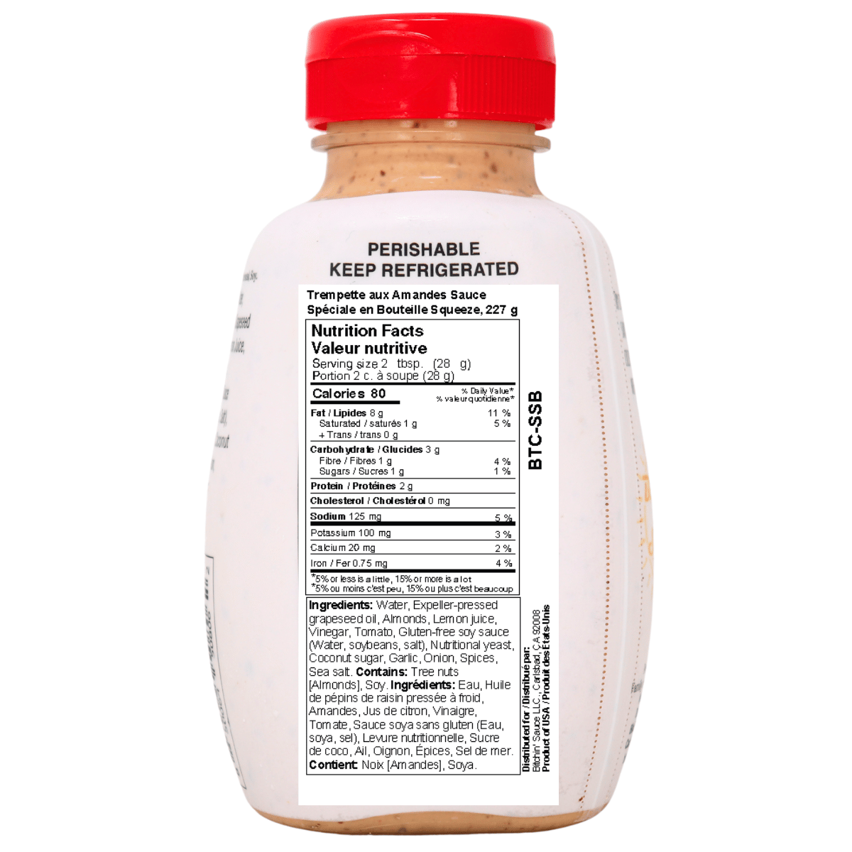 Water, Expeller-pressed grapeseed oil, Almonds, Lemon juice, Vinegar, Tomato, Gluten-free soy sauce (Water, soybeans, salt), Nutritional yeast, Coconut sugar, Garlic, Onion, Spices, Sea salt.