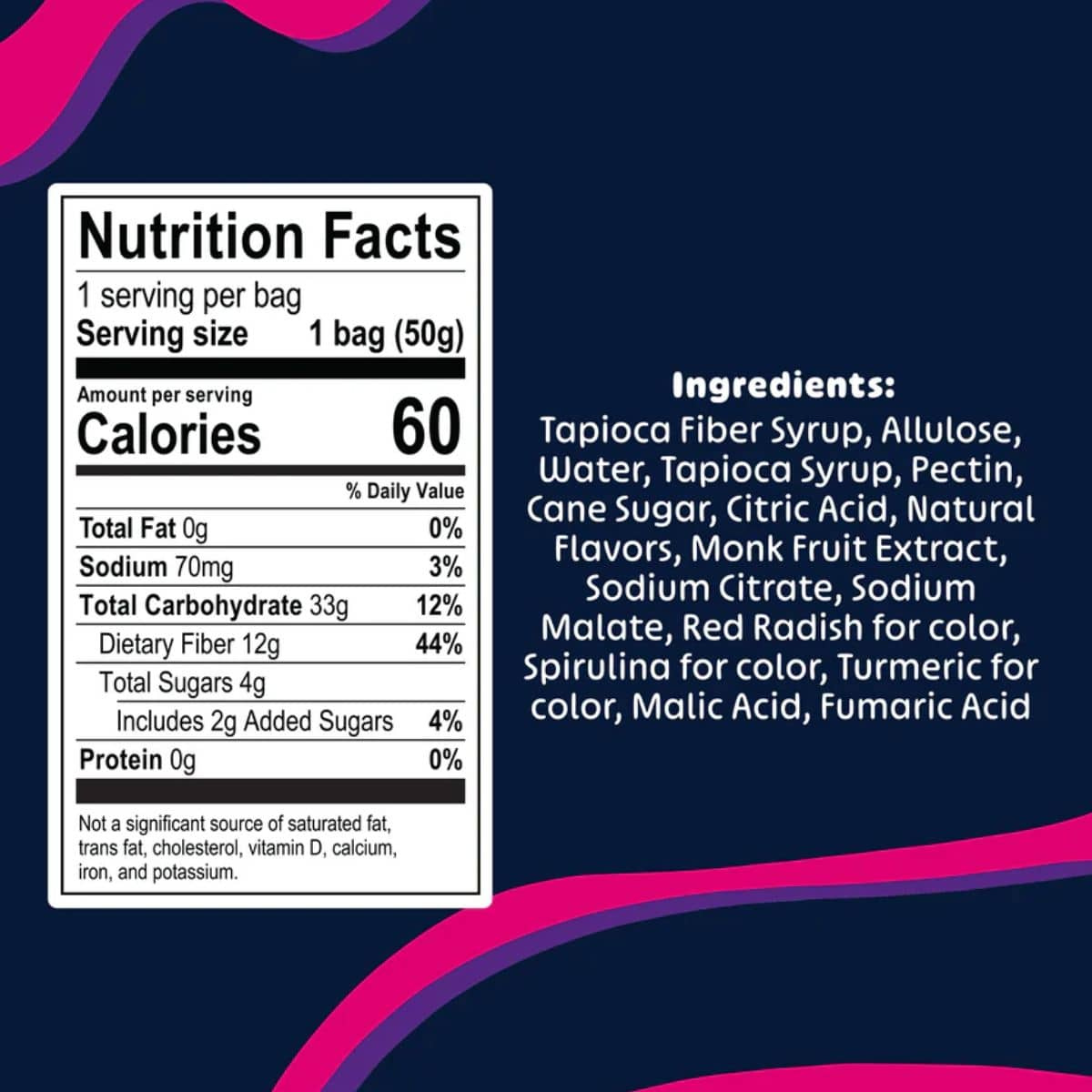 Tapioca fibre syrup, Allulose, Water, Tapioca syrup, Pectin, Cane sugar, Citric acid, Natural flavours, Monk fruit extract, Sodium citrate, Sodium malate, Red radish for colour, Spirulina for colour, Turmeric for colour, Malic acid, Fumaric acid.