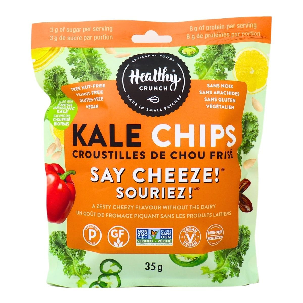 Healthy Crunch Kale Chips Say Cheeze offers the perfect combination of cheesy flavor and crispy texture. Made from real kale and seasoned with dairy-free cheesy goodness, these chips deliver a bold taste that satisfies cravings for something savory.