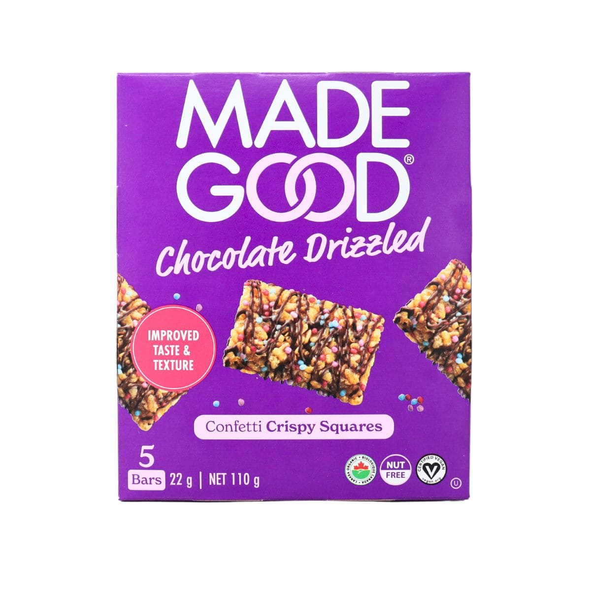 MadeGood Chocolate Drizzled Crispy Squares Confetti adds a fun twist to the classic crispy square with its vibrant confetti-like sprinkles and rich chocolate drizzle. These squares offer a delightful combination of sweetness and crunch, making them perfect for anyone craving a light yet satisfying snack.