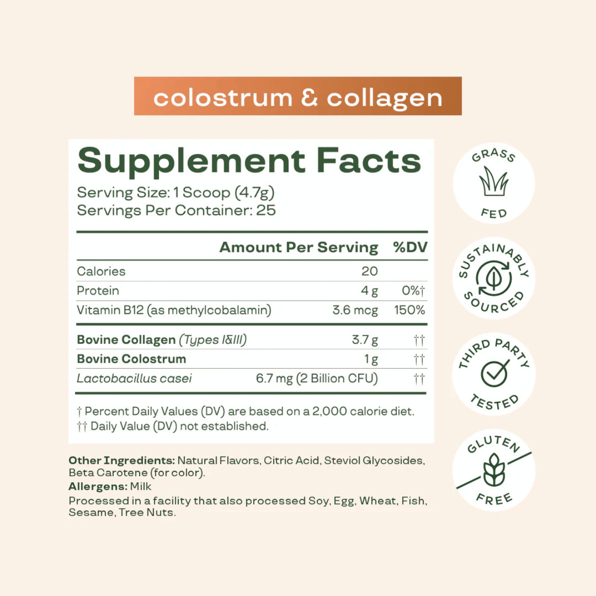 Bovine colostrum peptides, Hydrolyzed collagen peptides, Natural orange cream flavour, Citric acid, Stevia leaf extract, Sunflower lecithin.
