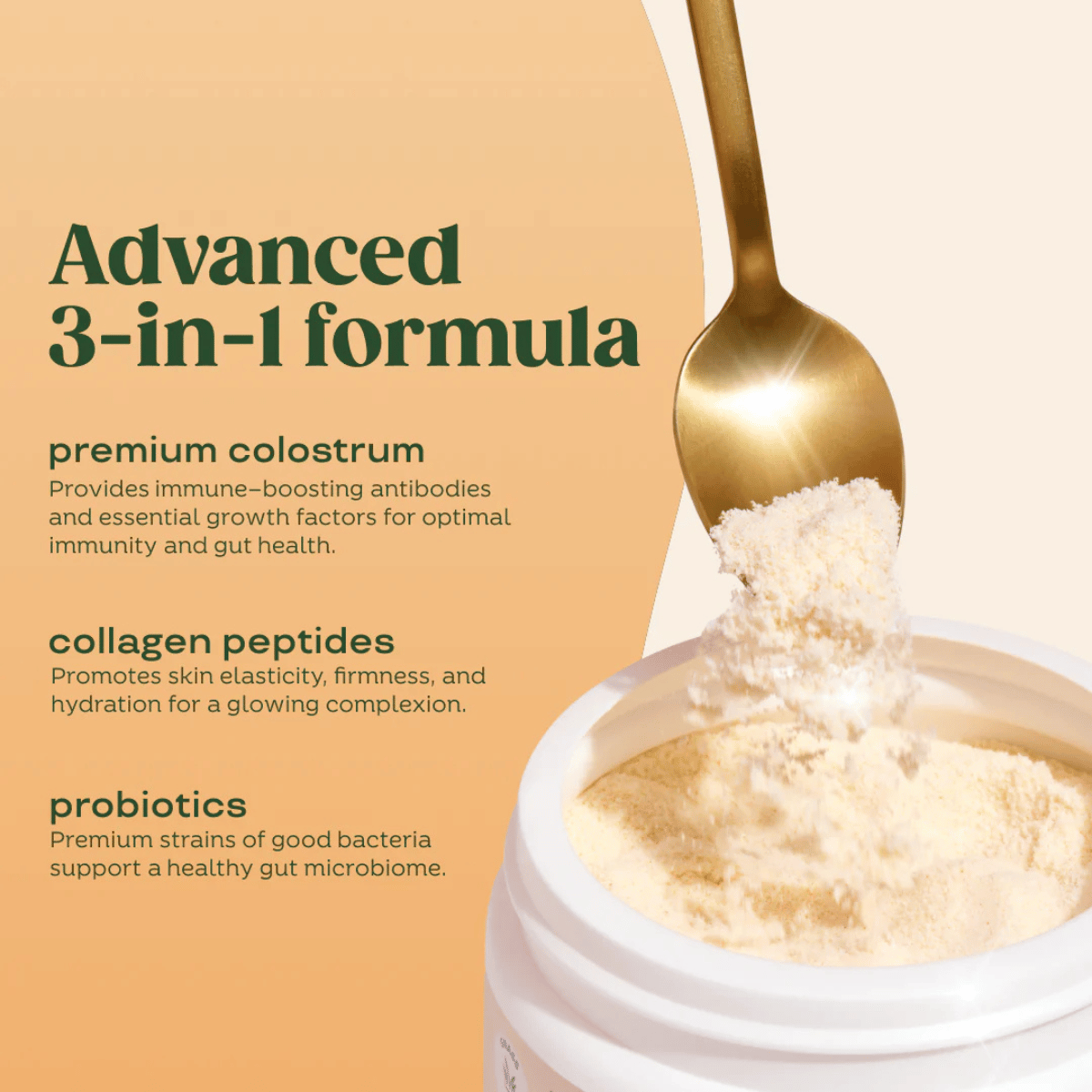 This carefully crafted blend combines the gut-supporting benefits of colostrum with the skin-rejuvenating power of collagen peptides. Naturally flavoured with a smooth orange cream taste, it’s an enjoyable way to support your digestion and promote youthful skin. Each serving delivers high-quality protein and bioactive compounds designed to enhance gut health and improve skin elasticity. Free from dairy, gluten, and artificial additives, this formula fits easily into your daily wellness routine without any unwanted extras.