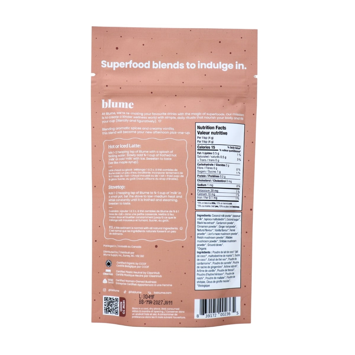 Coconut milk powder* (Coconut milk*, Tapioca maltodextrin*), Coconut sugar*, Black tea extract*, Cardamom powder*, Cinnamon powder*, Ginger root powder*, Natural flavour*, Vanilla flavour*, Fennel powder*, Lion's mane mushroom powder*, Maitake mushroom powder*, Shiitake mushroom powder, Ground cloves*.