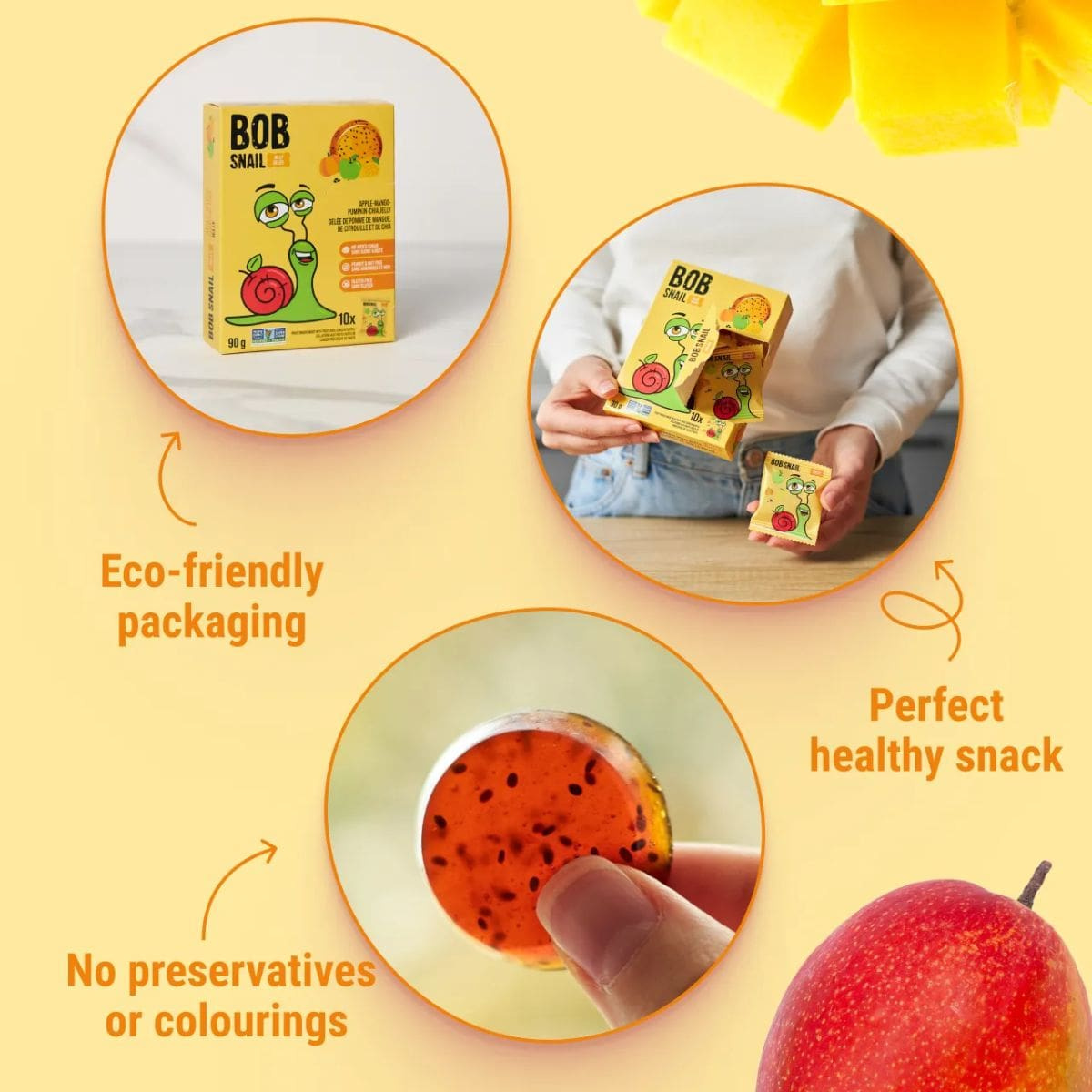Hold onto your shells because Bob Snail's got something truly special crawling your way. Make room for real fruit jellies! Made with nothing but real fruit juices, purees, and agar-agar (that’s a vegan thickening agent!), you’ve got a healthy fruit snack! With each wobble and wiggle, you'll taste the perfect balance of juicy apples, tropical mangoes, hearty pumpkin, and a sprinkling of super chia seeds, that adds a pop of fun and a whole lot of yum! Super tender, delightfully squishy, and oh-so-soft, each bite will make you want to break out into a wiggle and jiggle!