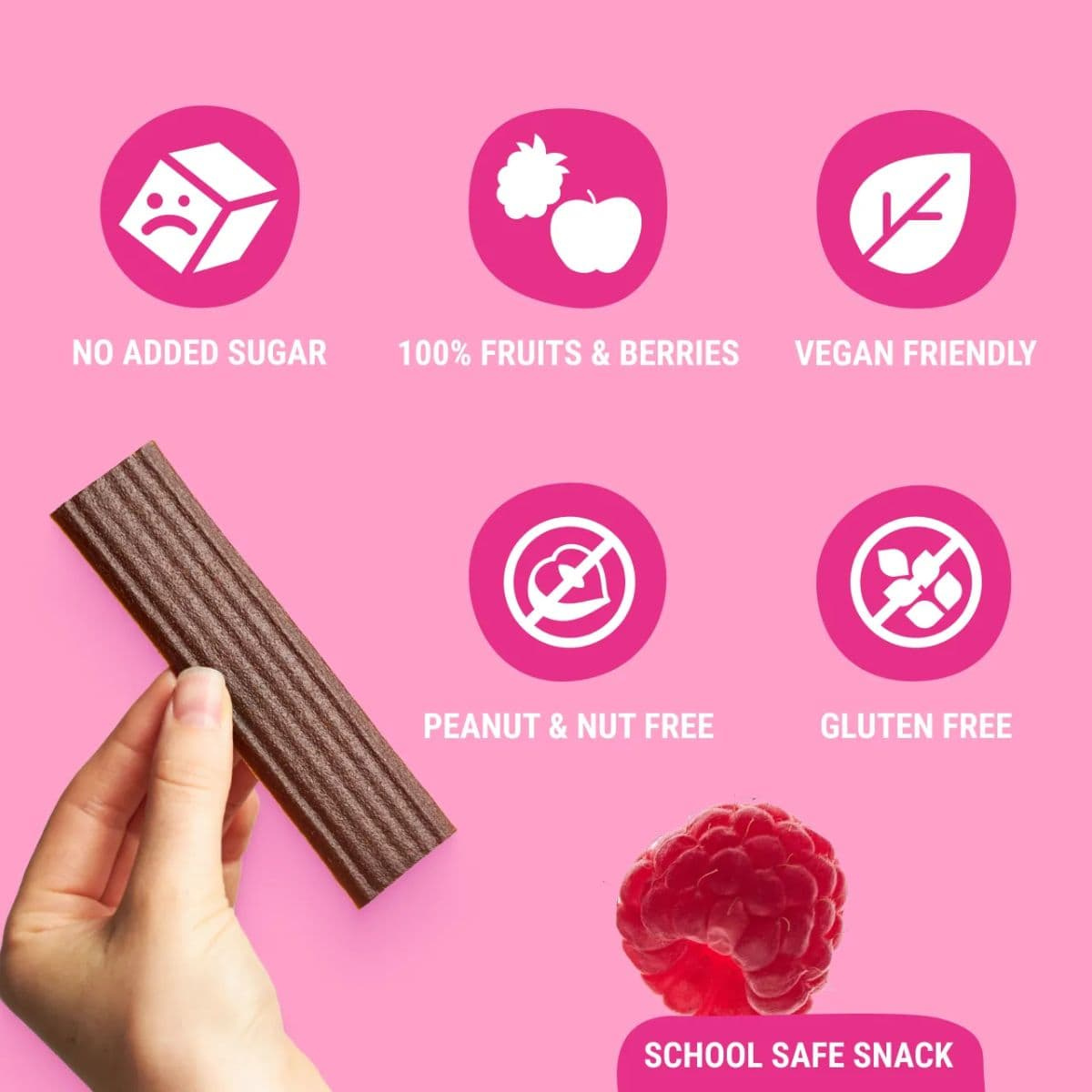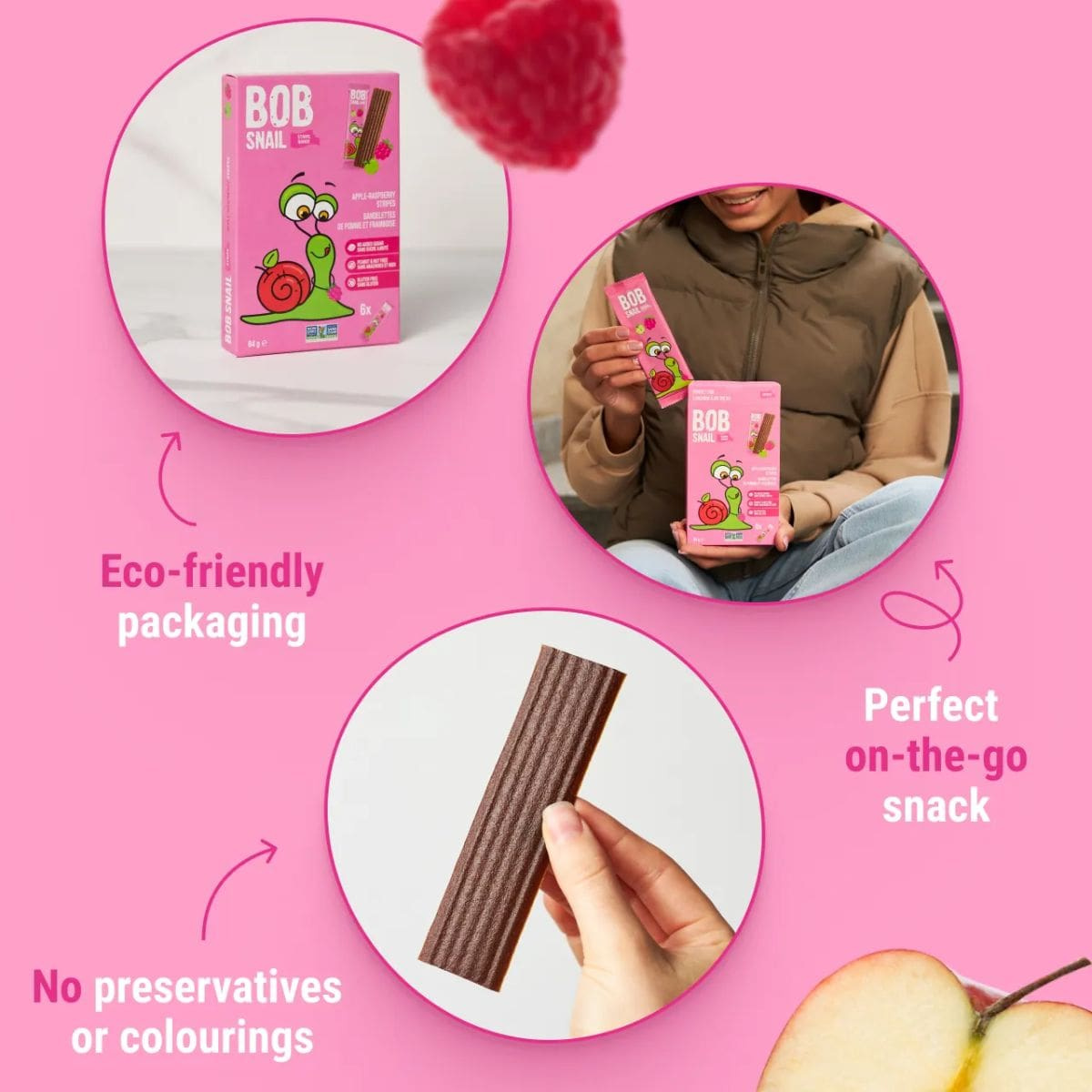 Some times, less is more, and Bob Snail is here to prove that! That's why he's stripped down his dried fruit stripes to just TWO wholesome ingredients: crisp apples and tangy raspberries! They're slow-baked to perfection, coaxing out every last drop of natural sweetness and bursting flavour. So every bite is like a tiny explosion of yumminess, with no need to any added sugar, artificial colours, or preservatives! Now that’s that kind of healthy fruit snack that’ll have you shouting, “shell, yeah” in no time!