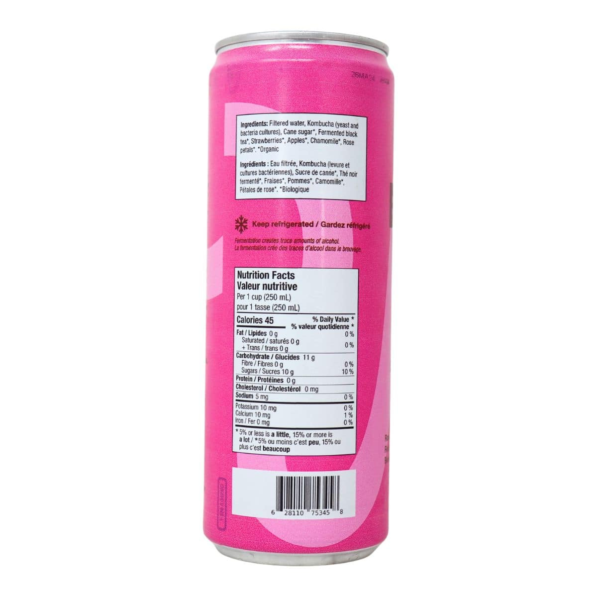 Filtered water, Kombucha (Yeast and bacteria cultures), Cane sugar*, Fermented black tea*, Strawberries*, Apples*, Chamomile*, Rose petals*.
