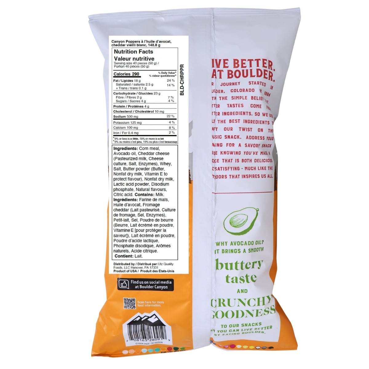 Get ready for a snack that pops off the flavour chart, Boulder Canyon Canyon Poppers Made With Avocado Oil Aged White Cheddar are here to level up your crunch game. These airy, crispy bites are kettle-cooked in smooth avocado oil and coated in a rich aged white cheddar seasoning that delivers big, bold flavour in every handful.