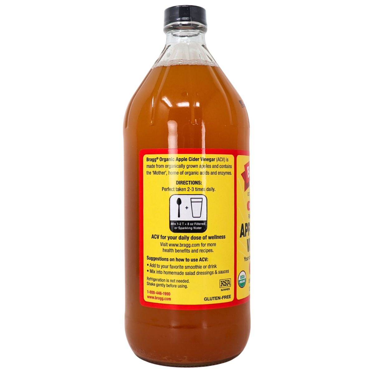 Certified Organic Bragg Organic Raw Apple Cider Vinegar is unfiltered, unheated, unpasteurized and 5% acidity, and contains the amazing Mother of Vinegar. Bragg Apple Cider Vinegar is organically grown, processed and bottled in accordance with the California Organic Foods Act of 1990; and is also Kosher Certified. It's a wholesome way to add delicious, light flavor to most foods. GLUTEN FREE. NON-GMO CERTIFIED.