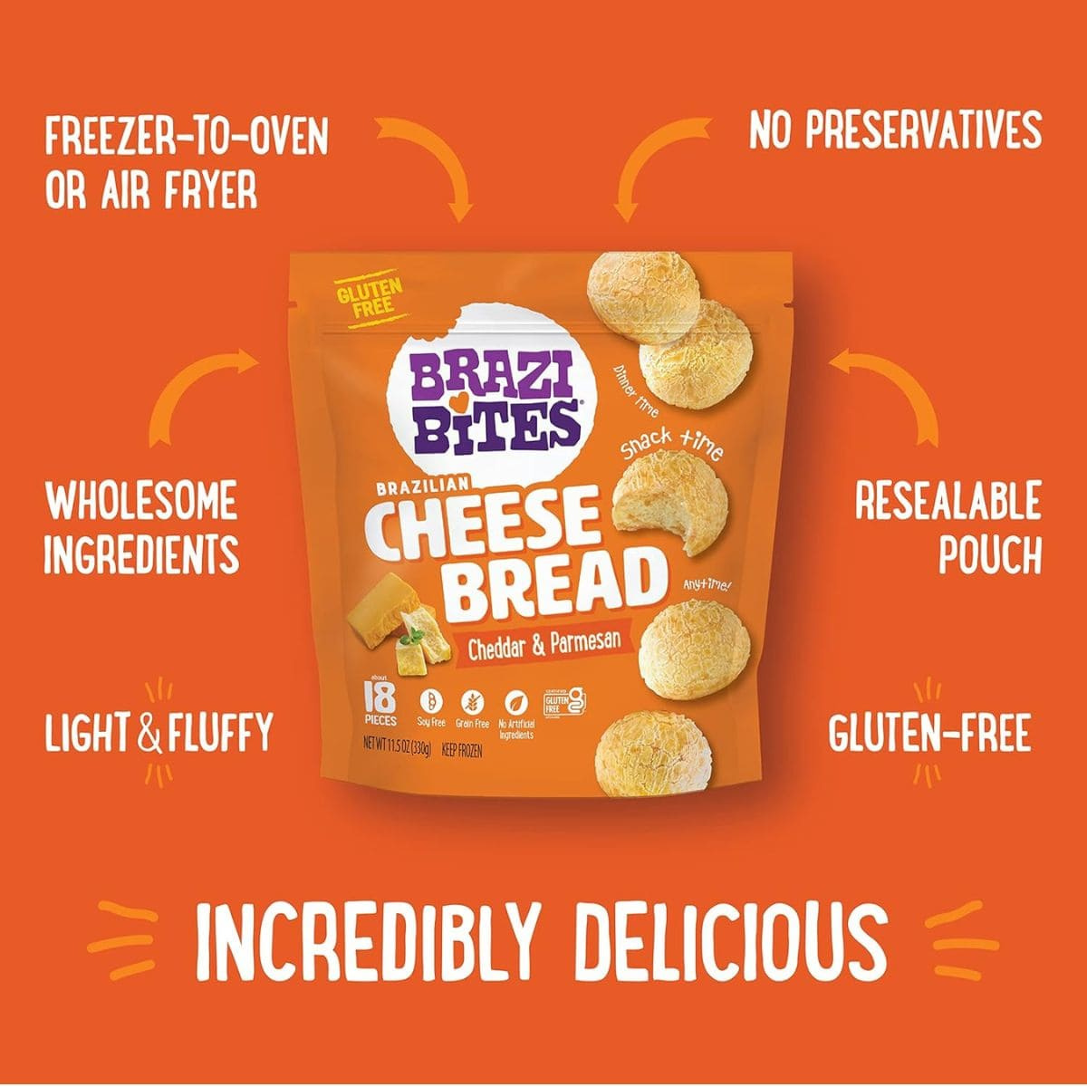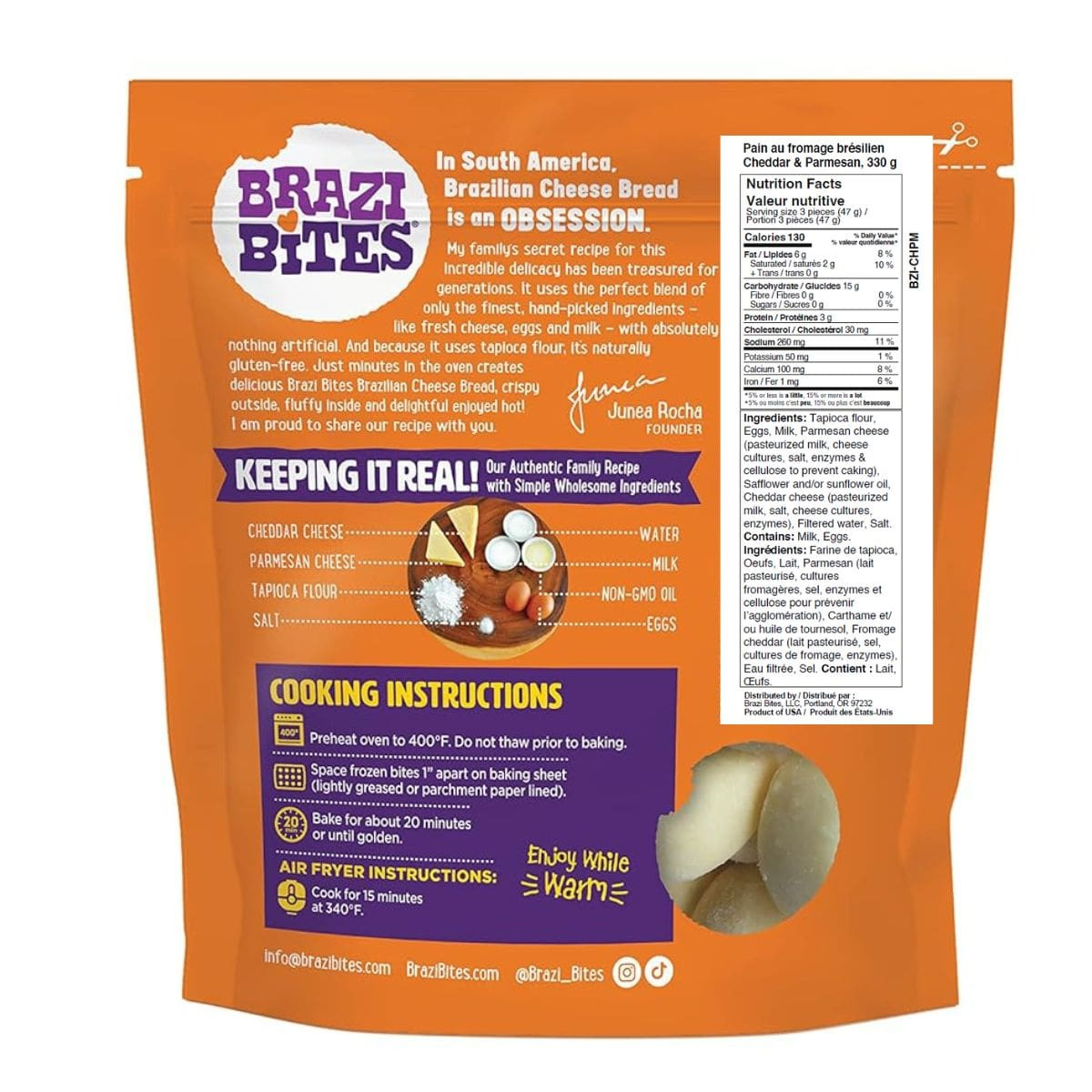 You just leveled up your snack game with Brazi Bites Brazilian Cheese Bread Cheddar & Parmesan! Inspired by traditional pão de queijo, these cheesy babies are crispy on the outside, fluffy yet chewy on the inside and packed with sharp cheddar and rich Parmesan. Made with simple ingredients, Brazi Bites' cheese bread are gluten-free, grain-free, and soy-free! Perfect as a midday pick me up, party appetizer or side to your favorite meal, these cheese bread bites are so good and so easy. Pop them in the oven, toaster oven or air fryer and you’ll have a golden cheesy treat in minutes. Snack smarter, snack Brazi!