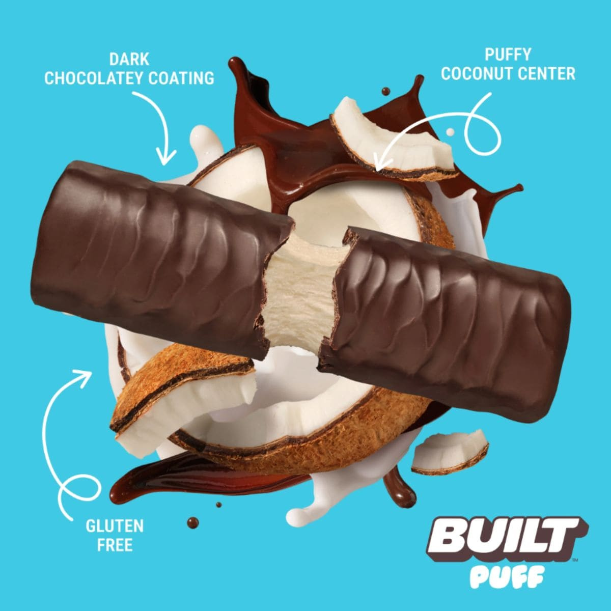 Built Bar Protein Coconut Puff is the low-sugar protein bar where decadent meets healthy! When you dive into a Built Bar Protein Coconut Puff, you’ll discover a light, coconutty, marshmallowy center, wrapped in a velvety dark chocolate coating. While your mouth enjoys a sweet treat, your body will thank you, too…because with a whopping 17 grams of protein, a boost of collagen, and only 140 calories, you’ll be treating yourself from the inside out with Built Puff Bars.