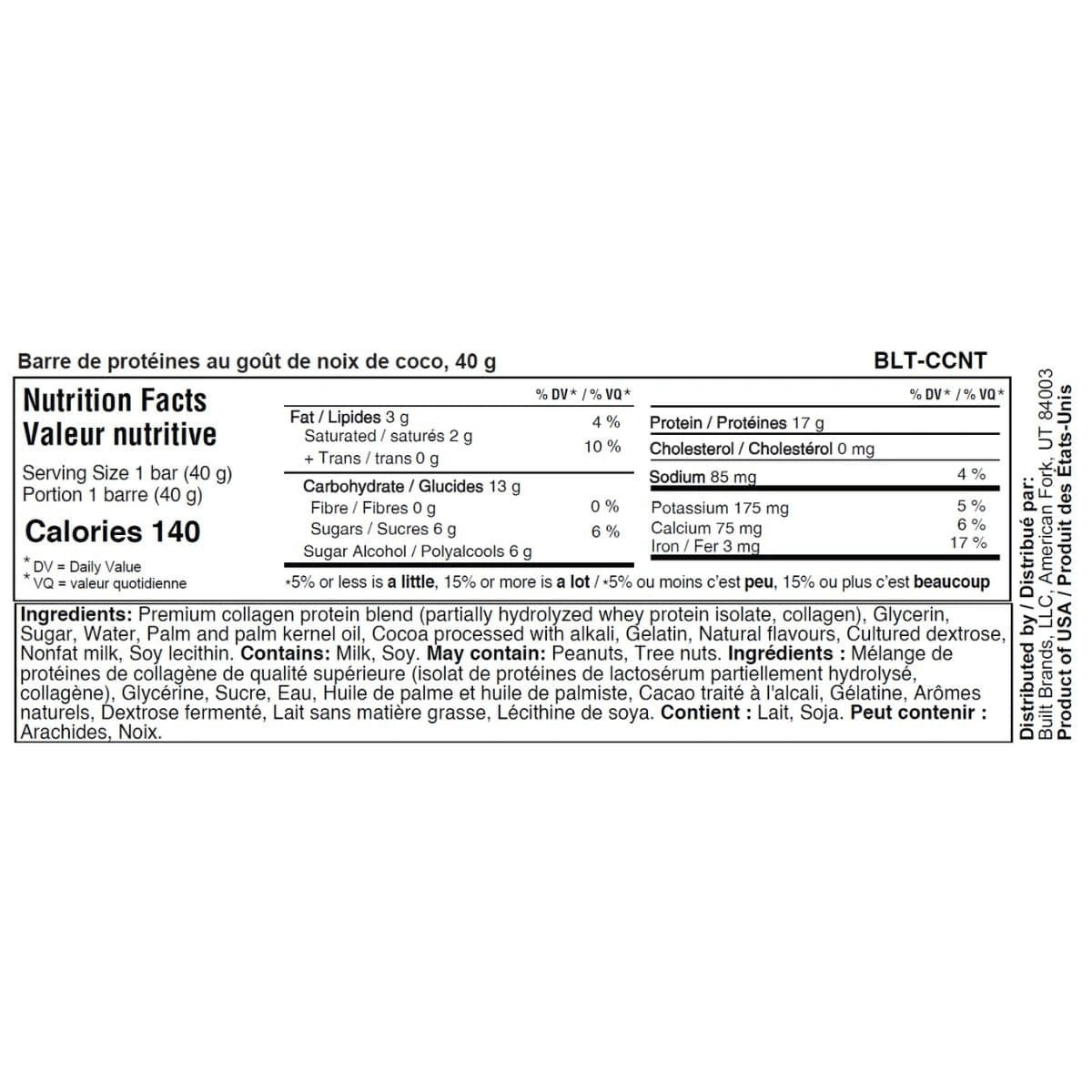 Built Bar Puffs Protein Bar Coconut, 40g -Â Premium Collagen Protein Blend (Partially Hydrolyzed Whey Protein Isolate, Collagen), Glycerin, Sugar, Water, Palm and Palm Kernel Oil, Cocoa Processed With Alkali, Gelatin, Natural Flavours, Cultured Dextrose, Nonfat Milk, Soy Lecithin.
