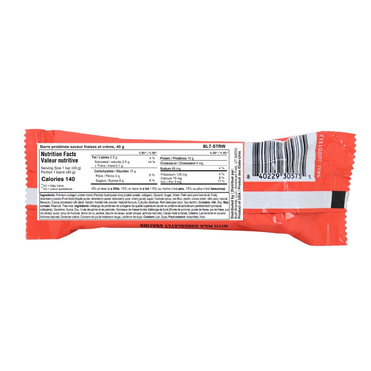 Premium collagen protein blend (Partially hydrolyzed whey protein isolate, collagen), Glycerin, Sugar, Water, Palm and palm kernel oil, Fruity strawberry pieces (Fruit blend [Apple puree, strawberry puree, strawberry juice, cherry juice], sugar, fructose syrup, rice flour, pectin, cocoa butter, citric acid, natural flavours), Cocoa processed with alkali, Gelatin, Nonfat milk powder, Natural flavours, Cultured dextrose, Red beet juice color, Soy lecithin.