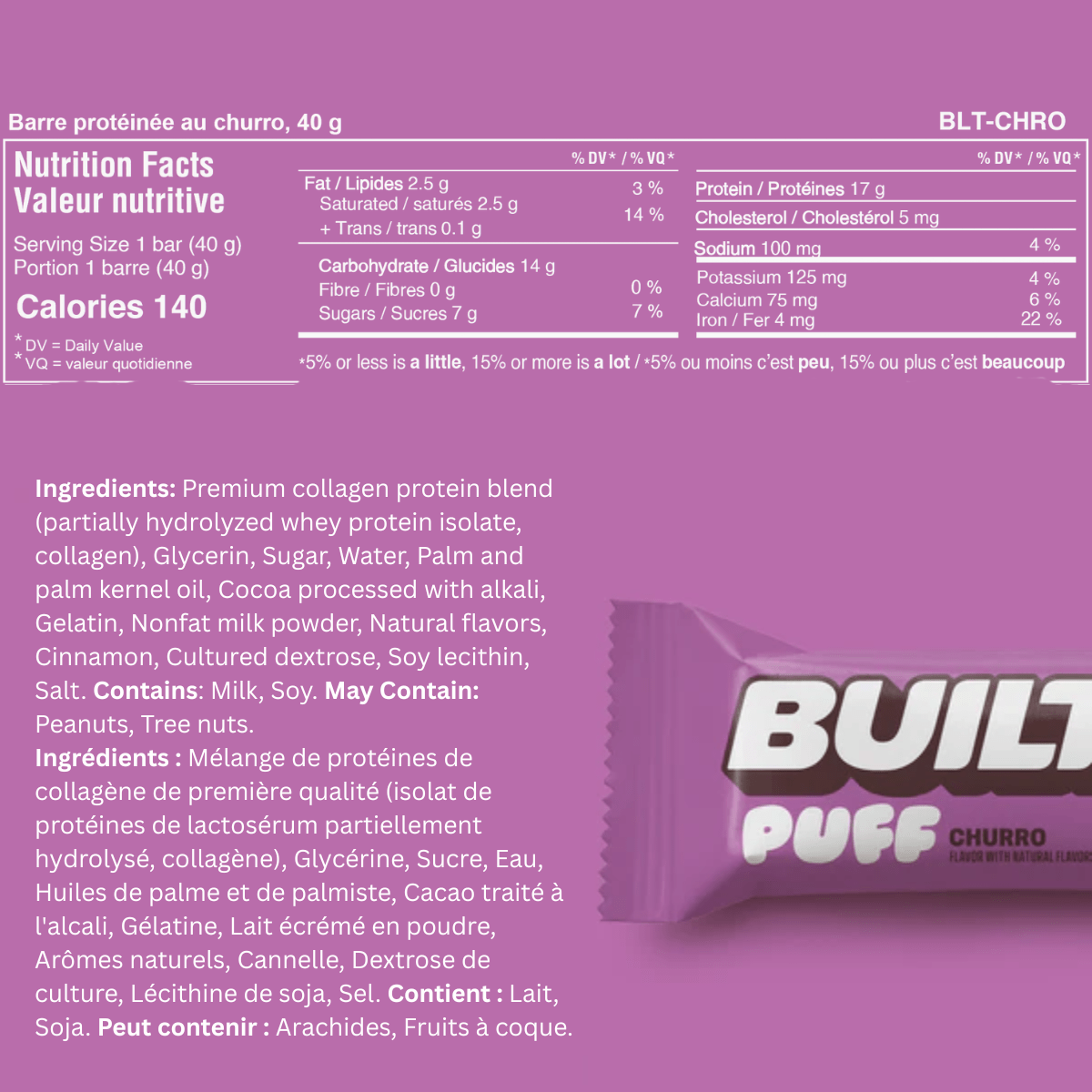 Built Bar Puffs Protein Bar Churro, 40g - Premium collagen protein blend (partially hydrolyzed whey protein isolate, collagen), Glycerin, Sugar, Water, Palm and palm kernel oil, Cocoa processed with alkali, Gelatin, Nonfat milk powder, Natural flavors, Cinnamon, Cultured dextrose, Soy lecithin, Salt.
