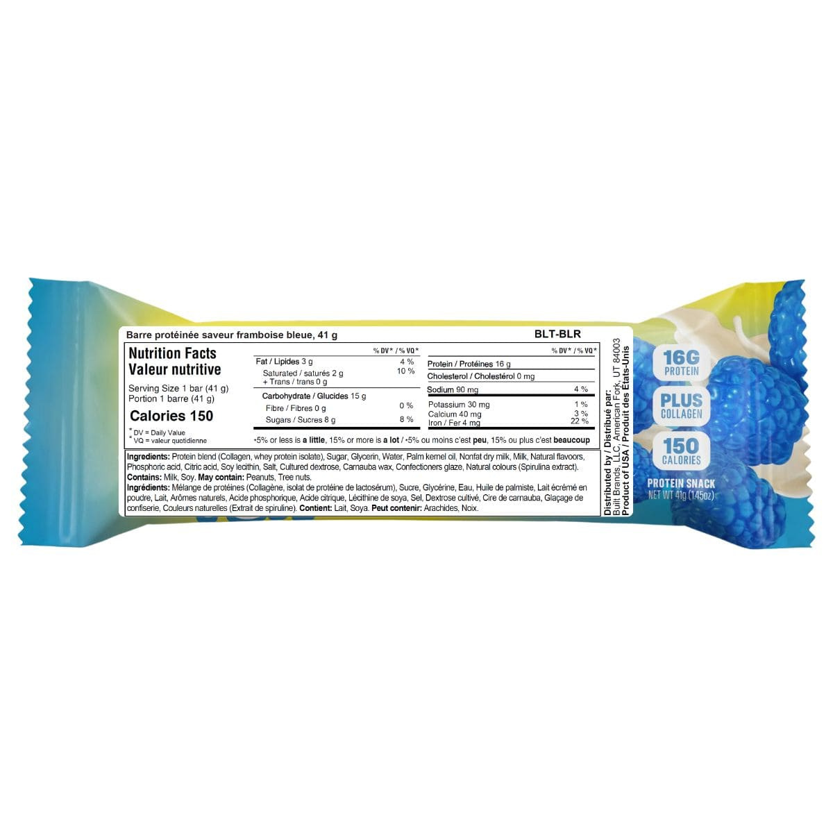 Built Sour Puffs Protein Bar Blue Razz Blast, 41 g - Protein blend (Collagen, whey protein isolate), Sugar, Glycerin, Water, Palm kernel oil, Nonfat dry milk, Milk, Natural flavours, Phosphoric acid, Citric acid, Soy lecithin, Salt, Cultured dextrose, Carnauba wax, Confectioners glaze, Natural colours (Spirulina extract).